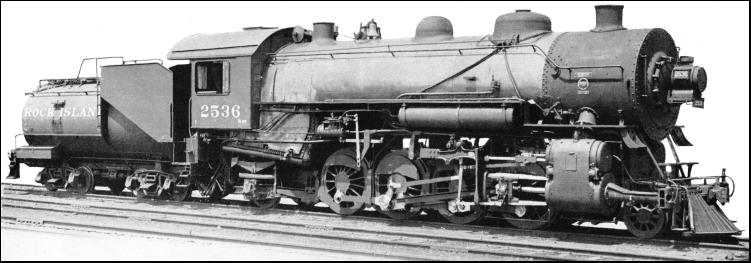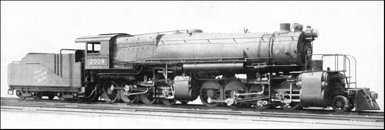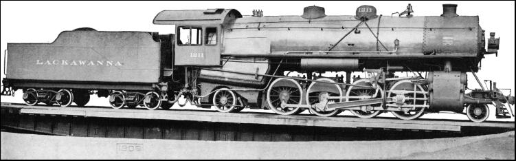 This articulated Mallet engine, built by the Baldwin Locomotive Works at Philadelphia, has proved highly successful in the heaviest class of mountain service. The Pennsylvania Company also have designed a very powerful locomotive, classified by the company as the H-8-b type, for its heaviest freight service. This engine has four pairs of 62-inch driving wheels, with a two-wheeled pony truck, 2-8-0 class. The total length of the driving-wheel base of the engine is 17 feet 0-1/2 inch, of the engine 25 feet 9-1/2 inches, and of the engine and tender 59 feet 5-5/8 inches. The cylinders have a diameter of 24 inches with a stroke of 28 inches. The Belpaire wide fire-box is used, being 110-1/4 inches long by a width of 72 inches, the total heating surface being 187 square feet. The boiler has a minimum internal diameter of 76-3/4 inches ; there are 465 tubes of 2 inches outside diameter, the total heating surface of the tubes being 3,652 square feet. Steam is used at a pressure of 205 pounds per square inch. The weight of the engine in working order is 119.15 tons, of which 105.5 are upon the driving wheels. In working order the 8-wheel tender weighs 79 tons, the complete weight of the locomotive therefore being 198.15 tons. An interesting experiment was carried out with this engine in order to ascertain. the precise freight-carrying possibilities of the 127 miles between Altoona and Enola Yard, opposite Harrisburg, Pennsylvania. This section of the system has been overhauled and reconstructed so as to secure no heavier rise than 12 feet per mile. Engine No. 1221 of the H-8-b type was attached to a train of 120 steel gondola cars laden with coal. Each wagon carried 52-1/2 tons of mineral, so that the total consignment represented 6,300 tons. The complete weight of the train, including engine, cars, and brake-van, or caboose, was no less than 8,850 tons. From end to end this train measured 4,888 feet—more than nine-tenths of a mile. Despite the huge load the one engine, having a tractive power of 42,661 pounds, hauled the train over the distance of 127 miles unaided, occupying 9 hours 36 minutes on the journey, giving an average speed of 13 miles an hour. As, however, this time included delays aggregating some three hours, the actual running speed averaged 19 miles an hour. In making the trip the engine consumed over 13 tons of coal. A unique feature of the train was a telephone connection between the brakesman in the rear van and the driver of the locomotive, the wires being carried along the sides of the vehicles. While the Pennsylvania Railway Company has no intention of operating such trains regularly, yet from time to time it embarks upon such tests to determine the capacity of its freight locomotives over the improved lines, where grades have been removed and Curves compensated. Recently some very powerful "Mikados," among the largest and most powerful of the 2-8-2 type, have been constructed. The Baldwin Locomotive Works have supplied some of the largest of this class yet built for the Chicago, Rock Island, and Pacific Railway, for service upon its system where no excessively steep grades are encountered. The characteristic feature of this design is the boiler, which is constructed with a wide and deep fire-box, 84 inches wide by 90 inches deep at back, and 77 inches deep at the front. The grate is placed behind the driving wheels and above the trailers, thus obtaining a large amount of grate area and furnace volume. The boiler is 86 inches in diameter, the tubes 21 feet long, having a total heating surface of 4,004 square feet. The driving wheels are 63 inches in diameter. The engine has a length of 35 feet 2 inches, the over-all length of the locomotive being 67 feet 2-1/2 inches. The weight imposed on the drivers is 121.6 tons, while the total weight of the engine and 8-wheel tender, the latter loaded with 16 tons of soft coal and 9,000 gallons of water, is 240 tons. Another well-known system, the Delaware, Lackawanna, and Western Railroad, has also introduced fifteen Mikados of much greater sustained capacity than those hitherto used in its service. They have been constructed by the American Locomotive Company, and are being employed in the slow and fast goods service between Elmira and Buffalo. The boiler, 86-1/8 inches in diameter, has a total heating surface of 4,592.8 square feet, and works at a pressure of 180 pounds per square inch. The fire-box is 108 feet long by 74-1/4 inches wide. The cylinders are of 28 inches diameter and 30 inches stroke. The grate area is 63.1 square feet, and the total heating surface 4,854.1 square feet with 1,085 square feet of superheater. The drivers, 63 inches in diameter, carry a weight of 118.75 tons, the total weight of the engine in working order being 156 tons. The 8-wheel tender, loaded with 14 tons of soft coal and 8,000 gallons of water, weighs 79.85 tons, bringing the complete weight of the locomotive to 235.85 tons. These engines, with a maximum tractive power of 57,000 pounds, are superseding Consolidation locomotives, having cylinders of 26 inches diameter by 30 inches stroke, and a theoretical maximum tractive power of 51,400 pounds, in the slow freight traffic, while in the express goods service they are replacing Mogul—2-6-0 class—with cylinders 20-1/2 inches diameter and 26 inches stroke, and a maximum tractive power of 29,480 pounds. Although these Mikados have the same cylinder stroke as the superseded Consolidation engines, they have drivers of 63 inches instead of 57 inches. So far as the Moguls are concerned, these Mikados have almost 100 per cent. greater capacity. Among the most impressive, and largest, as well as the most powerful engines yet constructed, the Mallet compounds built by the Atchison, Topeka, and Santa Fe Railway, forming what are known as the "3000" class in the railway's service, stand preeminent. The engine alone weighs 308 tons, of which 275 tons are distributed over the twenty driving wheels, the art