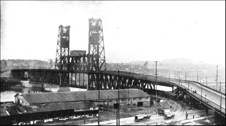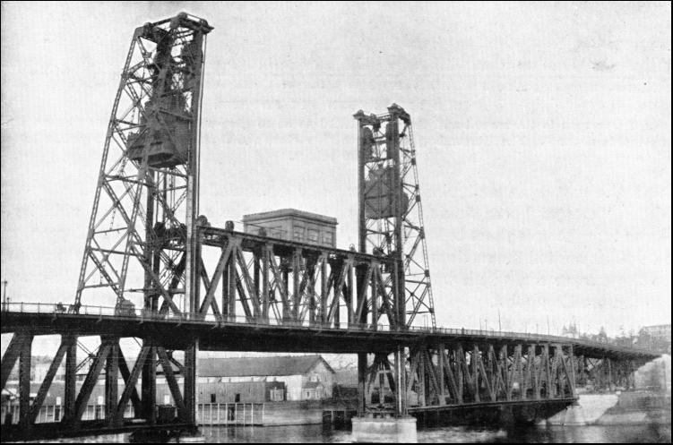 Recently a new and ingenious development in connection with the last named method has been introduced. It is the patent of two American engineers, Waddell and Harrington, and it possesses many interesting features. The Oregon-Washington Railroad and Navigation Company desired a new entrance into the city of Portland, Oregon. The Willamette, which divides the city in twain, is a broad, deep river, enabling large vessels to reach this point from the sea. When the railway first entered the city it built a large steel bridge with a swing span, which it was concluded would meet all the requirements of navigation and yet at the same time would not hinder railway operations. But the trade of the port has increased amazingly during recent years, with the result that the swing span was constantly having to be opened and closed. On the yearly average this occurred 70 times a day—practically once every 20 minutes—while in one interval of 24 hours it has been opened as many as 134 times. Such frequent manipulations handicapped the railway traffic very seriously, so the company decided to build a new bridge across the waterway, 700 feet above the original swing bridge. This decision was seized as an opportunity to improve the vehicular and pedestrian traffic between the two banks, so a double deck bridge was adopted, the lower deck being for the railway, and the upper level for public use. But the question of protecting the navigation interests arose. The various methods of operating a moving span economically and expeditiously were investigated at length. In this case the problem was complicated by the top deck used by the public, which it was essential should be kept open as much as possible so that inconvenience to vehicular and pedestrian intercommunication might be reduced to the minimum. Obviously, both the swing and bascule systems had to be ruled out of court, because it was impossible to place the upper deck at such a level as to be beyond interruption at intervals. It was a peculiar problem which demanded a special solution. The railway engineers thereupon investigated the Waddell and Harrington invention, and finding that it met the situation very completely, it was adopted forthwith. The river channel is crossed by three spans—a fixed span 287 feet in length on either side, flared at the shore ends to provide for the necessary curvature of the railway lines, and a centre movable span 220 feet long. The public deck of the bridge being nearly 50 feet above the level of the railway, suitable approaches at the ends had to be provided to secure an easy grade. That at the east end is by means of a viaduct 305 feet in length; on the west bank there is a highway approach 512 feet long. Thus the over-all length of the structure is 794 feet for the railway, and 1,611 feet for the public use. The moving span, which rises vertically between two towers by means of counterweights, is telescopic. That is to say, the moving span is so built that the lower deck may be raised independently of the upper deck. This is a distinct advantage, inasmuch as this vertical travel amounts to 46 feet. Accordingly, when the railway deck is raised until it touches the floor of the upper deck, a clearance of 72 feet above low water is secured. This is sufficient headroom for the greater proportion of the river traffic, so that there is no necessity to disturb the public highway. When, however, a large vessel with tall masts approaches, demanding a greater clearance, the bottom deck first is telescoped, and then, together with the higher level of the span, is lifted until the whole moving part comes to rest near the top of the towers, whereby a clearance of 165 feet at low water is given. By this provision all but the very largest craft coming to Portland are able to proceed through the bridge. The independent movement of the bottom deck is accomplished by supporting the railway floor system and lateral truss on hanger posts from the upper movable span. Each hanger is connected to four cables, and is designed to move vertically inside the corresponding vertical post of the upper movable span. Both railway and public decks are counterbalanced with concrete weights. The lower moving section has eight of these counterweights, disposed four on each side, each section of four having an aggregate weight of 212 tons. The upper deck has two similar weights, each weighing 866 tons. The river piers were sunk by the open caisson method. These were landed on cement gravel at a depth of 123 feet below low water. The six dredging wells were excavated to a depth of 10 feet below the cutting edge of the caisson, and the concrete was deposited under water by means of bottom dump buckets. In the completion of the sub-structure work some 30,000 cubic yards of concrete were used. The steel viaduct carrying the highway approach on either side was erected by means of a 30-ton skid derrick, having a boom 45 feet in length. This plant also set the upper floor system and laterals for the fixed spans, as well as the lower members of the two towers, the heaviest single piece which it was called upon to handle weighing 29 tons, represented by a beam for the upper deck. The two fixed spans were erected by the aid of timber false-work, which was built upon the double bent system with 22 piles. For the raising and placing of the truss members and the lower floor a barge, or scow, derrick was devised. This had sheer legs 110 feet in length, fashioned from four heavy piles. By means of this apparatus a chord section weighing as much as 54 tons was set in position.