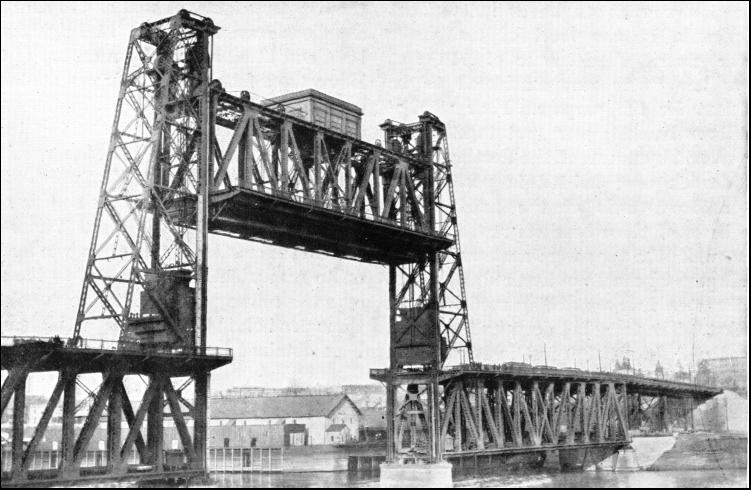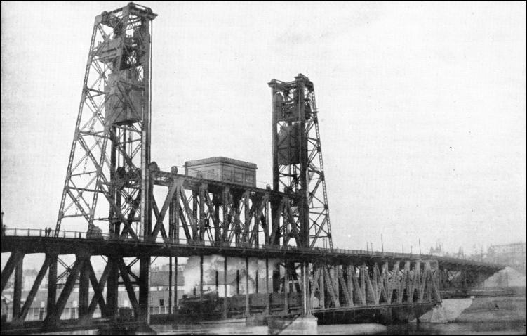 ONE of the most perplexing situations in railway building is the necessity to cross a busy waterway at a low level, owing to the physical characteristics of the banks on either side. In order that no serious restriction may be imposed upon navigation, it is imperative that the bridge shall be provided with some means of opening so as to permit vessels to pass up and down easily. When this handicap is associated with a busy city, spreading over the opposite banks, the problem becomes aggravated, as the engineer is cramped for space in which to achieve his object. Many ingenious methods have been elaborated to meet such conditions. There is the swing bridge, in which a span of the bridge is able to swing round in a semicircle upon a pivotal pier, thereby providing two channels—one on either side of the support. Another expedient, which has come into vogue extensively during recent years, is the bascule bridge, in which the moving section of the structure, being hinged at one end, is raised and lowered like a drawbridge. A third method, which, however, is not employed very freely, is the vertical lift bridge, wherein the span is raised bodily in conjunction with counterweights, between two supporting towers, this system being similar in its principle and operation to the sash-line window.