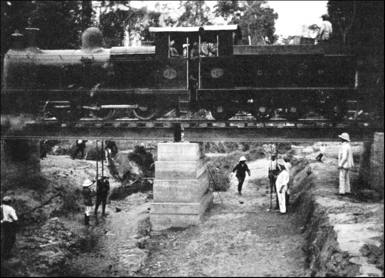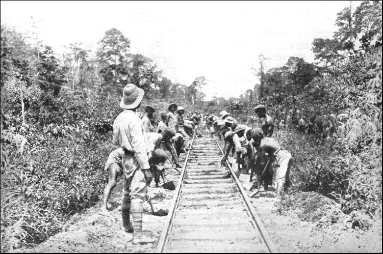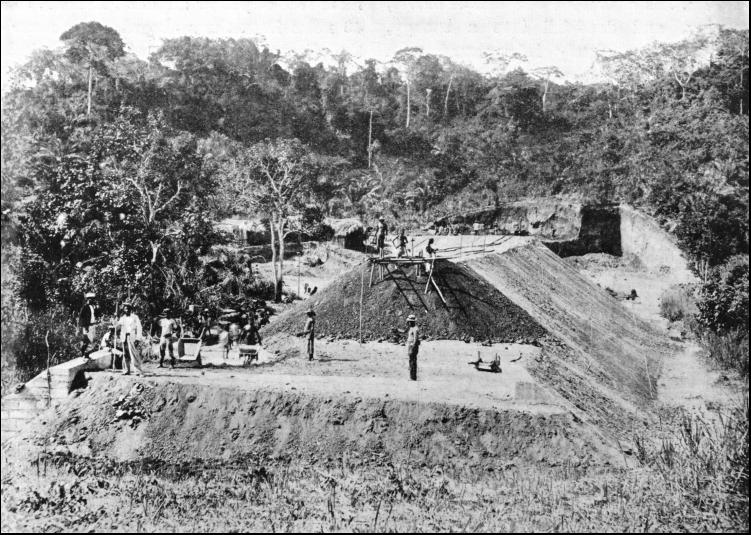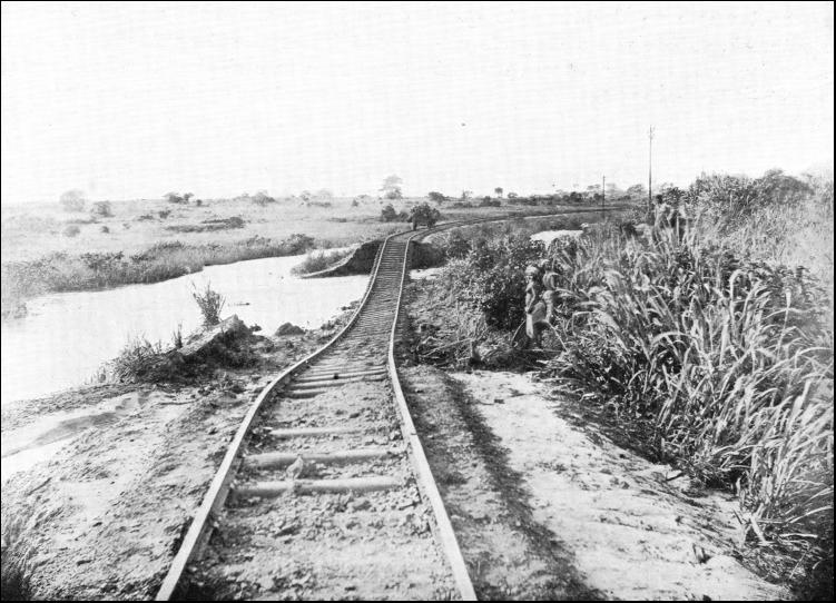 The idea of criss-crossing these vast expanses of virgin territory by the railway was suggested first by Mr. (afterwards Sir) William Shelford, M.Inst.C.E. Railways were the obsession of this accomplished engineer, and he concentrated his activities and skill upon West Africa. In the early nineties of the last century he attacked the problem vigorously, because he foresaw that, once this untouched region was given a fair start, settlement and development must go ahead with a rush. At that time West Africa was a veritable "Tom Tiddler's Ground," awaiting the coming of the capitalist and toiler. But the machinery of development could not be set in motion until facilities were offered for access to the interior. The shore of the Gold Coast is hemmed in by a thick belt of jungle, 150 miles or more in width. To venture into this huge, un-trodden forest demanded no small amount of pluck and determination. The exotic vegetation presented a solid barrier, through which advance could be made only by hacking and cutting, since the jungle was intersected by very few, narrow, and tortuous paths, trodden down by the feet of the natives. The railway conquest of West Africa was inaugurated with the dispatch of a survey party to Sierra Leone in 1893 by Mr. Shelford, the Colonial Office having decided to open up the hinterland. Actual constructional work was commenced in 1896. Step by step the railway, of 2 feet 6 inch gauge, was driven forward from Freetown until it had reached Pendembu, 230 miles up country, and a short distance from the Liberian frontier.