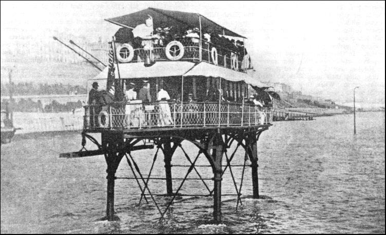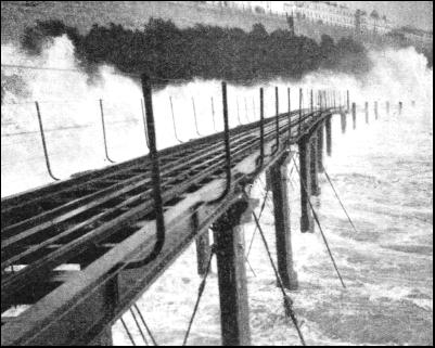 In its present form the line, which is mostly single track, though equipped with adequate passing places, is laid on the 2 ft. 8-1/2 in. gauge, being the only line in the kingdom constructed to that dimension. The longitudinal sleepers have given place to the more customary cross sleepers, the running rails are of the Vignolles pattern, and the conductor third rail of channel section steel on earthenware insulators. The original little vehicle has been replaced by a total of ten cars, some closed and some open. The latter are known as "toast racks," a design that greatly facilitates quick entrance and exit. The seating capacity of each car is thirty-two, but, since strap-hanging is allowed, as many as fifty people can be accommodated in a vehicle. In spite of the small size of the undertaking, the line carries an average of well over a million passengers a year. It is a point of pride with the management that the five-minute service, which is maintained throughout the twelve months, has been operated for nearly fifty years. Moreover, although the purpose of the railway is primarily to cater for holiday-makers, it has also proved itself to be a valuable addition to the general traffic facilities of Brighton and Kemp Town. The generating plant has officially been described as being situated "in a cave in the sea wall." The main equipment consists of a 90 h.p. motor generator converting the Corporation electric supply of 460 volts direct current to the track voltage of 160. There is also a small reserve 20 h.p. set. Two types of motor are in use, three care being of the original Siemens link belt-drive type, and the rest of modern tramway pattern, with single reduction gear, and generating from 7 to 8 h.p. at 750 revolutions a minute. All the transmission gear is fitted with either ball or roller bearings. The original generator was still in use as a motor in one of the cars as late as 1934. The Rottingdean Extension, which ran from Brighton to Rottingdean, was one of the most remarkable railways ever built. For, while Volk's Electric Railway ran—and still runs—over the sea in places, the Rottingdean Extension ran through the sea. This extension, which received Parliamentary sanction in 1893, can best be described as a line whose tracks were laid on the shore, so that they were submerged at high tide, while the car, which resembled the midship portion of a Thames pleasure steamer, was supported by a combination of stilts and runners. At the time of its inauguration the Rottingdean line was generally known as the "railway on stilts." It was planned to begin near Paston Place, and thence to proceed "along the beach and foreshore on the level between high and low water mark at a distance of about 100 yards from the cliff to the village of Rottingdean, terminating at a point on the seashore immediately to the westward of Rottingdean Gap." A jetty or landing stage was provided at the Rottingdean end. This extended into the sea a distance of about 200 ft.