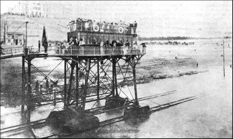 The car, which had accommodation for about 160 passengers, was 50 ft. long and 22 ft. wide. According to a story current at the time, the Corporation of Brighton refused to grant a licence to the undertaking unless the structure carried a lifeboat. The vehicle was accordingly provided with a lifeboat to meet the requirement. The four legs, or stilts, on which the vehicle was supported were steel tubes, through which passed shafts acting on the wheels. Two of these shafts, which were actuated by bevel gearing, conveyed motion to the wheels, while the other two worked the brakes. Each of the legs terminated in a four-wheeled bogie, shaped rather like an inverted rowing-boat, and having in front a metal contrivance for keeping the rails clear of sand, seaweed, and other obstructive matter. Two of the bogies ran on one of the two tracks ; the other two ran on two parallel tracks. The bevel gearing was encased in grease boxes, with the dual object of ensuring adequate lubrication and keeping out the sea water. Each driving bogie was actuated by a separate electric motor, situated on the main deck of the vehicle, and current was fed to the motors by overhead wires, the construction of which caused considerable controversy at the time. The current was generated on the Rottingdean pier terminus, the plant furnishing 120 h.p. at 500 volts. The Brighton terminus consisted of a jetty, with waiting-rooms for the accommodation of passengers. The bottom of the car was some 23 ft. above rail level, and the vehicle weighed about 36 tons with motors, and could travel at six miles an hour. After the approval of the Board of Trade had been obtained, the line was opened in September, 1896. It attracted considerable attention in the Press. One journal, which referred to the attractions of "a coasting trip, without the terrible internal disturbances by which such aquatic jaunts are not infrequently accompanied," characterized the undertaking as "about as fin-de-siecley as anything that can be imagined." Another newspaper, in a leading article called "Trains on Stilts," asked its readers to "consider the possibilities and potentialities of this astonishing railway," which "will, of course, revolutionize sea travel as the locomotive revolutionized land travel. In a short time we may expect to see a railway running from Dover to Calais . . . and later on, when experience has bred confidence, will be opened the London, New York, and Melbourne Railway on Stilts. . . . The great ocean liners, reduced to mere cargo boats, will be crawling along to port and starboard, steering by the light of our flying windows." This enthusiastic leader writer even went so far as to predict the construction of railways on stilts to "the moon, Mars, and other outlying places on the firmament," and "the sun himself will have a trunk line." Unfortunately, these predictions failed to materialize, and the Brighton and Rottingdean Tramroad itself had only a short life. Shortly after its opening it was badly damaged by the gale that destroyed the Old Chain Pier. The promoters were, however, not daunted by a mishap on the possibility of which they had no doubt reckoned, and the line was repaired and reopened. Changes in the seashore, however, eventually put a stop to working, and the track had to be taken up. So ended the life of a railway that remains unique in the history of transport. But it has been pointed out by Mr. Volk that the construction was of a purely experimental nature, and that if the money had been available for an improved type of car, much better results would have been obtained.