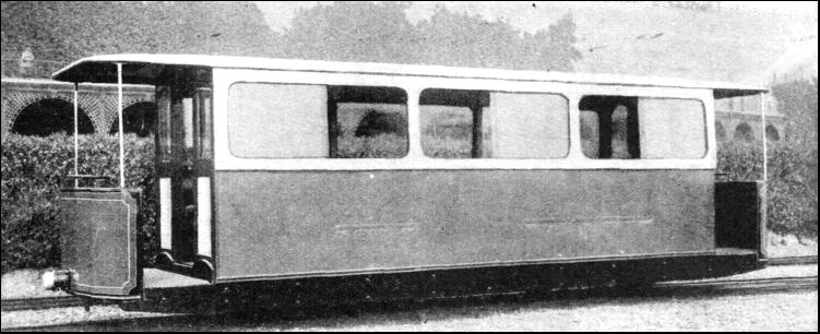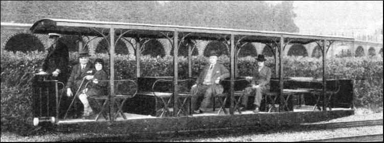 The original permanent way was composed of flat-bottomed rails weighing twenty pounds to the yard, and spiked to longitudinal sleepers. These measured ten feet by nine inches by three inches, and were coated with tar. Shingle was used as packing. The gas engine that furnished the power was set up in an arch under the roadway opposite the Aquarium, developed nearly three horsepower in working, and drove a self-regulating generator giving current at fifty volts. A machine of similar size, but with magnets and an armature arranged in series, was installed in the car as a motor. From its earliest days, the railway attracted considerable attention in the press. A contemporary account refers to "the electric car, which (so Mr. Volk informs us) is a model of the interior of the deck saloon on a steam yacht ; constructed of solid mahogany, plate-glass windows, a panelled ceiling with paintings of flowers and palms ; blue silk curtains to the windows, mirrors, and so on. The exterior is precisely that of a first-class railway carriage, with the exception that the footboards are protected by brass rails." This description is not that of the first vehicle, which, as will be seen from the illustration below, was hardly of so ornate a character. That was, however, scarcely to be expected, since the car, together with the dynamo and motor, was built, the generating plant installed, and the track laid, within eighteen days. This period must be regarded as remarkably short, when the pioneer nature of the whole work is borne in mind. Despite the opposition of interested parties who feared competition, the Brighton Corporation—very soon after the opening—gave permission for an extension from the Aquarium to Paston Place. This was speedily followed by a further extension to the existing terminus at Black Rock. Between August, 1883, and the beginning of the following January, a total of about 300,000 passengers had been carried, and the volume of traffic showed that the railway, even in its short initial form, had definitely filled a public need.