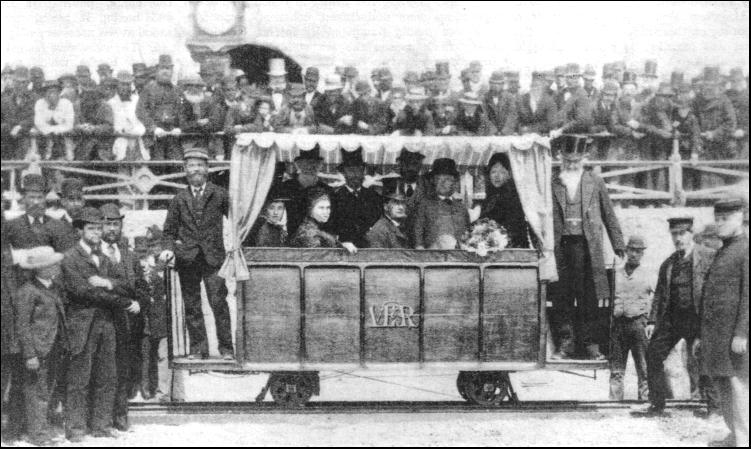 The official opening day was August 3, 1883. During August Bank Holiday of that year, when the line was in operation for eleven hours, the single car in its possession is said to have carried about a thousand passengers and to have run an aggregate of fifty miles. As originally constructed, the gauge of the railway was only two feet. The small four-wheeled car was driven by current generated from a two horsepower gas engine, and ran at a service speed of six miles an hour. Despite gloomy predictions as to its impracticability, the railway was a popular success from the first. The announcement of the opening of Volk's Electric Railway attracted large crowds of spectators, the more especially as it was expected that the car would not work. In this the crowd was disappointed, as when started by the Mayor, the car with a heavy load moved away easily and without a hitch. Permission for the operation of the line had originally been granted for only six months, but this period was speedily extended. In the meantime the success of the undertaking had given rise to much local antagonism, especially on the part of the cabmen, boatmen, and persons engaged in the hay and corn-chandlering trades. Sleepers, sign-boards and other equipment began to develop the habit of disappearing overnight. Nature also took a hand ; a series of violent storms wrecked the line four times in a single summer. Although the damage was at once repaired in every instance, the work added greatly to the cost of running the system. Mr. Volk's plucky fight, however, brought him both sympathy and offers of financial support, including the opening of a subscription list by a local newspaper that produced sufficient funds for the repair of the whole line. Thus Mr. Volk was enabled to keep the line open and to remain its owner, instead of abandoning it or handing it over to a company or public authority.