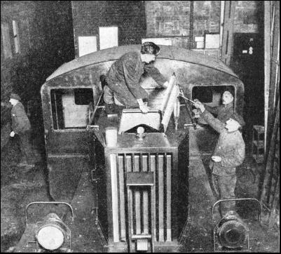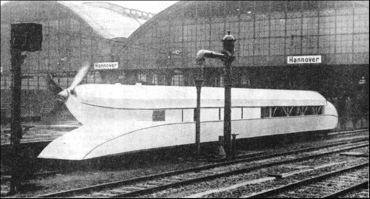 These heavy cars, travelling at high speeds, and without streamlining, against the enormous resistance of the atmosphere, whirled up the ballast to such an extent that the sound of its impact against the undersides of the floors was similar to a continuous hum. In the rear, the displaced soil and loose stones followed the cars like miniature tornadoes. The running of the cars themselves, however, was surprisingly smooth. More than thirty years have passed, but Germany has not lost her love of high-speed trials, and to-day she operates high-speed passenger services in addition. A primitive air-screw-propelled car was tried on the Berlin-Hamburg line very shortly after the war of 1914-18. It consisted simply of an ordinary van with aeroplane engines and screws mounted at either end. Some remarkable speeds were attained, but no developments followed. But in 1931 occurred an event of importance in railway history. Dr. F. Kruckenburg invented a remarkable rail-car, built of aluminium, carried on four wheels only, scientifically streamlined, and propelled by a powerful aero engine with a single air screw at the back. Midsummer morning, this strange car set out over Germany's recognized railway race-track—the Berlin to Hamburg main line—and covered the whole of it at an average start-to-stop speed of 99.4 miles an hour, reaching a speed of over two miles a minute. The aeroplane which accompanied the car had considerable difficulty in keeping pace. This average is the present record for railway speed. The electric cars just described belong to the experimental and not to the practical side of German railway working. The practical side now requires attention. A start may be made with the "Flying Hamburger," more fully described elsewhere on this site. This was the first high-speed rail-car in the world to operate a regular express service. This pioneer "lightning-train," as the Germans have called it, was built at Görlitz in 1932, and consists of two streamlined coach-bodies mounted on three bogies. The middle bogie supports both bodies, in the manner first introduced on the old Great Northern Railway of England by Mr. H. N. Gresley in the earlier part of this century. The end bogies carry the electric driving motors. These derive their energy from generators driven by two Maybach heavy-oil engines, each developing 410 h.p., which are situated at either end of the articulated car. The inside contains second-class passenger accommodation of the most comfortable description, rivalling that in the Pullman type coaches of the steam-driven "Rheingold Express," which runs between the Hook of Holland, Basle, and Zurich. The appearance is that of a long, open corridor carriage without partitions. The two car bodies between them provide seating accommodation for 102 persons. In one there is a luggage locker, and in the other a refreshment counter. The interior fittings arc plain but beautifully finished, and the velvet covered upholstery is designed to eliminate all corners and crevices where dust and dirt might lurk. There is one large window to each division on either side of the coach. The exterior of the car, resembling the coaches of the "Rheingold Express," is painted in purple and cream, with gold lines ; the roof has the colour of aluminium. Swiftly and quietly, day after day, the "Flying Hamburger" maintains the "extra fast" service between Germany's capital and her greatest port, without dust or cinders, and with barely any smoke save a faint blue blur from her fore and aft exhaust pipes.