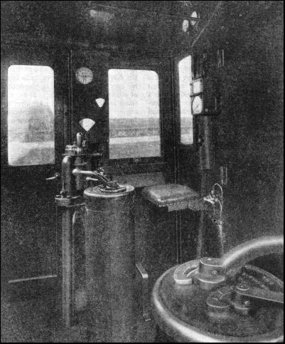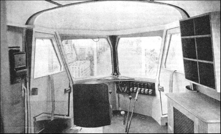 The control fitted to this rail-bus, from the driver's standpoint, approximates to the steam locomotive pattern. Three levers, working in a slotted cover, operate the throttle, the forward and reverse drum, and the engine stop and start switch, the necessary apparatus being for simplicity and economy incorporated in one set (instead of the usual two sets), situated near the engine and controlled by compensated heavy-duty steel wire rope running on pulleys. A lightly operated "dead man's button" fitted to the end of the throttle handle allows perfect safety with one-man operation, without causing any fatigue or inconvenience when driving. A departure has been made from the usual railway type of braking, in the adoption of Ferodo-lined expanding shoes, which work in brake drums mounted on the inside of the running wheels ; the four brakes of each bogie are actuated by a small compressed-air cylinder, linked with the hand brake rigging of the rear driver's cab. Rise and fall of the axle in the horn guides are permitted by allowing the expanding brakes to ride on lubricated bushes on the axle. A small standard motor-driven Westinghouse air compressor keeps the reservoir automatically filled to the correct pressure. The "dead man's button" on the throttle lever, if released inadvertently, applies the brakes in addition to cutting off power. A passengers' emergency brake valve is situated in the vestibule.
