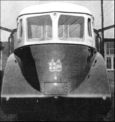 The general arrangement of this rail-car is as follows. One of the A.E.C. 130 horse-power Diesel engines transmits its power through a fluid flywheel, Wilson pre-selective gear-box, and reverse gearbox to the worm-and-wheel drive on two of the wheels of one bogie unit, in the manner of the single-engine rail-car previously described. The other identical type Diesel engine drives one of the wheels of the other bogie, through a reverse gear-box ; it has no other gearbox. To make quite sure that the two engines operate at the same speed a device is incorporated in the throttle connexion between the two engines, so that the direct drive engine is given a full throttle opening only when in top gear, the opening at starting being about one-quarter. One of the Diesel engines, with its transmission units, is arranged in an accessible position on one side of the chassis, while the other is placed in a similar position on the other side. To provide ample cooling when travelling in either direction the radiator is set diagonally and the air is drawn through it by means of a cowled fan ; this air is collected by one or other of a set of louvers. A hinged plate, automatically operated, ensures that the air stream from the appropriate louvers is directed towards the cowl. The coach arrangements include a compartment at each end in the "nose" of the body for the driver, with space for luggage in the larger one of these compartments. The hot water supply in the lavatories is ingeniously provided by utilizing the exhaust gases of the engines ; this apparatus is the silencing system also, the gases then passing through an exhaust pipe in the roof. There is a buffet, divided across its centre by a counter with four seats facing it. The two passengers' saloons are divided by the gangway connecting the two central doors and are fitted with forty fixed seats and with removable tables. The electric lighting is arranged to give a soft diffused effect. Tubular lights with two bulbs are fitted on the side panels above each seat and the same type of lamp is used down the centre of the roof. Ventilators for extracting the air are placed on the roof and above the windows. Electric fans are provided in the buffet compartment, and a heating system is also installed in the saloons, buffet and driver's compartments. Specially designed heaters are used for this purpose. Armstrong Whitworth, Ltd., have built several types of Diesel rail-coach and rail-car at their Scotswood works, near Newcastle-upon-Tyne ; some are in service both in Britain and abroad. The types with which the present page is concerned are the 250 h.p., 140 h.p., and 95 h.p. designs. In the two smaller rail-cars, the design of the chassis and coachwork is identical, but the choice of engines is left to the purchaser. This type, known as a "rail-bus," is one of the lightest of its kind, weighing only seventeen and a half tons in working order and seating fifty-seven passengers, or seventy-one when no luggage compartment is required. It has been the aim of the manufacturers to ensure that maintenance can be carried out by the normal staff of a railway running shed, and no features are incorporated which are not within the experience of the modern railway workshop using road transport as an ancillary service. For this reason they have avoided the ultra-light coach, with pneumatic-tyres and fabric body, as well as the other extreme of ultra high-speed aeroplane-engined rail-car. The Armstrong-Saurer standard commercial road vehicle engine is employed, which has shown itself able to withstand the extremely rigorous conditions of commercial road service with lower maintenance costs and even greater reliability than the petrol engine. The A.B.E. (patented) transmission is so simple that it requires practically no attention in service. It eliminates the usual starting motor and charging and lighting generator. What little attention it requires in service is of a mechanical nature and can be done by the ordinary locomotive shed or carriage staff. Major repairs to the transmission can be carried out by the train lighting staff or by the existing locomotive works electrical department. This simple electrical transmission has a life at least twice that of any mechanical gear, even when the latter is protected by a hydraulic gear and is self-changing, and its maintenance costs are very considerably less. Bogies of orthodox but light construction are employed. Great care has been taken in the design of the whole vehicle, including the body. The aims have been reliability, safety, and avoidance of high maintenance costs which might follow excessive weight cutting. A most interesting feature of the design is perhaps the effective streamlining of coach ends and sides, which are scientifically proportioned to reduce air resistance to the minimum compatible with making full use of the coach length and width. The tare weight per passenger seat is as little as 0.31 ton or 0.25 ton, according to the number of seats provided.