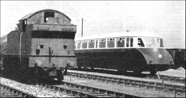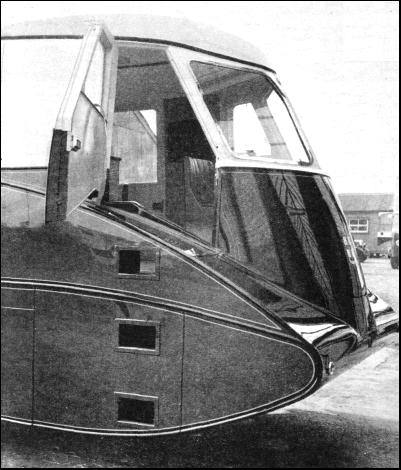 The body provides an example of light road-vehicle construction adapted to the more rigorous requirements of railway service ; this was made possible by the provision of two deep pressed steel underframe members centrally placed, instead of the usual channel solebar construction. The floor framing of oak is flitched with 8-gauge mild steel plate to the pillars, which are also flitched at all important joints with steel plate. The exterior is panelled in 18-gauge aluminium, except the car ends, which are of hand-beaten steel. The fittings are mainly of chromium metal. Half-drop windows in light metal frames are fitted in the passenger compartment, with fixed safety glass driving windows and drop windows in the guard's compartment and driver's cab. Seating is of the most modern "tub" type two- and three-seat pattern, upholstered in moquette over patent rubber cushions. Coach heating is by means of a small radiator through which passes some of the engine cooling water ; a belt-driven fan directs the warm air upwards through a duct to two smaller ducts running the full length of the passenger compartment at the skirting board, and fitted with a sliding louvre between each pair of seats. Passengers may therefore adjust to their liking the flow of warm air issuing from the louvre at their feet.