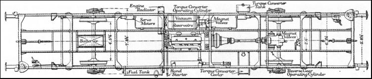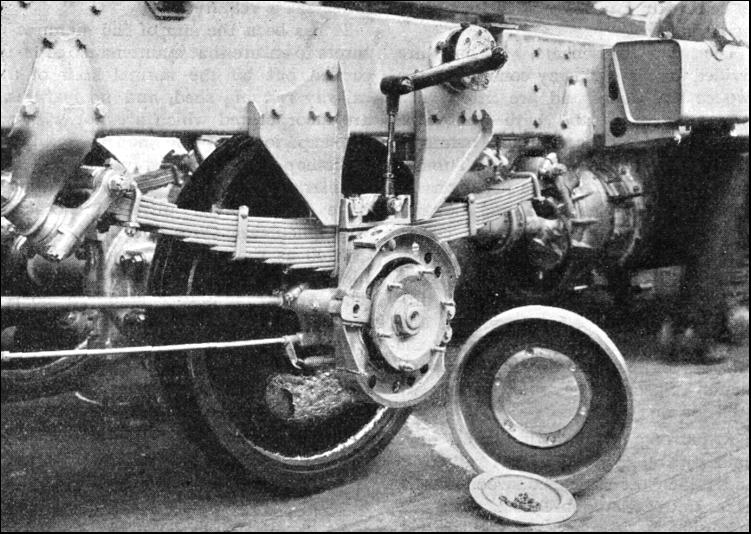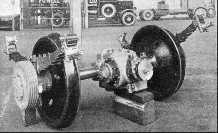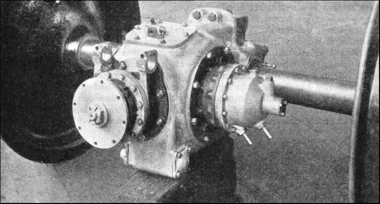 The axles rotate in roller bearings within their axle boxes. The chassis frame weight is transmitted through the usual pattern laminated springs to the tops of the axle boxes ; the latter slide in horn plate guides as in ordinary locomotive practice. The brakes, instead of being of the conventional rim type of shoe brake, are internally expanding brakes of the automobile pattern working inside brake drums. The braking force is obtained from the pistons of vacuum cylinders ; two such vacuum cylinders are mounted on each bogie. The vacuum required for these cylinders is maintained by two exhausters. One of these is mounted on the top of the gear-box and is driven from the output shaft of the latter by means of a chain and sprocket wheels ; the other exhauster is driven from the engine. The wheels are arranged for sanding gear, which is operated by vacuum from the brake supply system. The car is electrically lighted, a large-capacity accumulator being provided ; this is kept charged by means of the engine-driven generator. A conventional self-starter is provided, engaging with a toothed rim on the flywheel of the engine. An important feature of the engine cooling arrangement is the provision of an air-deflecting duct to direct the air in front through the water-cooled radiator, which is mounted in front of the engine. The rail-car is fitted with duplicated controls for the driver, at both ends of the body ; this obviates the necessity for turning the vehicle on the rails, since it can be driven equally well from either end. The controls comprise an accelerator pedal, reverse gear lever, ratchet hand-brake, finger-control lever for the vacuum brake and another for the wheel sanding gear, and the pedal used for the Wilson gear-box. The hand-brake lever at either end of the coach only applies the brakes on the wheels of the bogie immediately beneath it. The two levers are not interconnected. The reverse gear lever and the pre-selector gear lever are, of course, interconnected. A larger type of A.E.C. rail-car, the design of which is largely based on that of the model just described, is also in service. Six of these larger vehicles were ordered in 1934 by the Great Western Railway, and are in regular service. This larger type has two 130 h.p. high-speed A.E.C. Diesel engines, one driving direct and the other through a four-speed pre-selective gear-box. The fluid flywheel is used in each of these engines. Before dealing with the transmission and other technical details, it will be of interest to mention some general facts regarding the vehicle and its general performance. The rail-car is 63 ft. 7 in. long (overall), 11 ft. 8 in. high, and 9 ft. wide (overall), and has a streamlined body resembling that of the single-engine railcar previously described. It has only about one-quarter of the wind resistance of the square-ended type normally used. The four-speed gear-box employed enables speeds of 18, 32, 50, and 75 m.p.h. to be obtained when the engine is working at 2,250 r.p.m. On its demonstration trials one of these rail-cars made a return trip between Paddington and Oxford, in the course of which eight consecutive miles were covered at a speed of 70 to 72 m.p.h. and forty-four miles were run in forty minutes, giving an average speed of 66 m.p.h. Another trial run was made on the Birmingham to Cardiff route, when 117-1/2 miles were covered at an average speed of 56-1/2 m.p.h. The maximum speed attained during the trials was 76 m.p.h. The fuel consumption of this two-engined vehicle worked out at five to five and a half miles per gallon, which, with fuel at, say, 1s. per gallon, gives a remarkably low fuel cost. A public rail-car service was subsequently run between Birmingham and Cardiff, the supplementary charge of 2s. 6d. being made over the ordinary third-class fare.