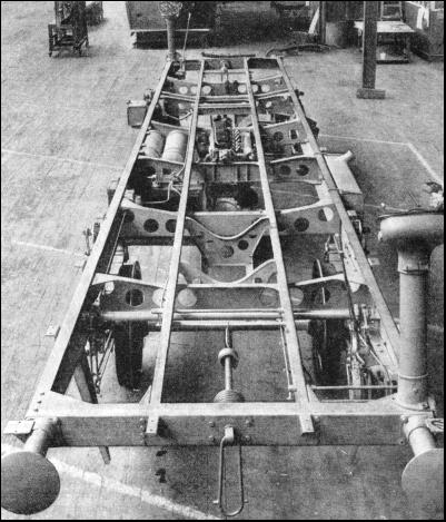 In this interesting rail-car the engine is placed in the central portion of the chassis, but on one side, to provide accessibility through a suitably arranged door in the body. The engine is connected to a special design of gear-box, known as the Wilson pre-selective gear, through a short shaft having metal universal couplings at the ends, and is fitted with the Daimler pattern fluid flywheel in place of the usual clutch found in motor-car practice. This hydraulic type of coupling allows the engine to take up the driving load smoothly and without shock, through the agency of the fluid employed. It is so arranged that when the engine is working at a low speed, say, at about 500-600 r.p.m., the hydraulic clutch is automatically disconnected from the rest of the transmission, namely, the gear-box. Upon accelerating the engine above this speed, the drive is transmitted through the hydraulic clutch to the gear-box. There is thus no necessity for the ordinary friction type of clutch ; nor is any clutch pedal necessary. All that the driver has to do to start the rail-car from rest is, first, to select the low-gear position of the gear lever, and then to speed up the engine from its idling speed, when the rail-car will gradually move forward on its lowest gear. After a certain speed has been attained, the gear can be changed through the higher gears to the directly driven top-speed position. The Wilson gear-box is of an automatic type similar to that employed on the Armstrong-Siddeley and other motor-cars. The principle of this arrangement is that any desired gear ratio can be selected, by means of a small lever and graduated quadrant having the corresponding gear ratio positions marked upon it. The gear ratio likely to be required can thus be selected beforehand. When the pre-selected gear ratio is wanted all that the driver has to do is to depress a foot pedal, known as the "gear change pedal," and release it. The selected gear is then automatically engaged. The hydraulic clutch is here very useful in preventing any shock to the transmission when the gear is changed. The combination of the hydraulic clutch and pre-selective gearbox renders the driving control extremely simple. The gear-box gives four forward speeds and one reverse. Speeds of 14.45, 25.4, 40.25, and 60 m.p.h. are obtainable with this gear-box for an engine speed of 2,260 r.p.m. Beyond the gear-box there is a reverse gear-box to enable the rail-car to travel at any of its four speeds in either direction. A dog-clutch is employed to change from one direction of drive to the reverse. From the reverse gear-box the drive is taken by means of a shaft having universal joints and a telescopic sliding device to the worm-and-wheel drive on the front axle member of the four-wheel bogie unit. The rear member of the latter is also positively driven by means of a universally jointed shaft and another worm-and-wheel unit, from the front shaft. To allow for any differences in the diameters of the driving wheels a differential gear mechanism is provided in the front axle box casing ; this prevents any undue driving stresses between the two axle units. Only one of the two four-wheel bogie units is driven by the engine ; the other is an idle member.