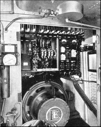 The coach has five compartments—the engine-room, a driving compartment at either end, the passenger compartment, and a luggage-room. The engine-room, which is of steel construction throughout, is separated from the passenger compartment by the luggage-room ; the bulkhead on the side nearest the passenger compartment is lined with a special sound-deadening material so that no engine noise reaches the passengers. The roof of the engine-room can be removed to enable the power unit to be lifted out bodily for major overhauls. The interior finish of the passenger compartment is of polished mahogany, with mahogany mouldings and chromium-plated metal fittings. The seats are upholstered in figured moquette and have removable cushions. Access to this compartment is afforded by a central entrance controlled by sliding doors, as in underground electric train practice. At the trailing end of the coach the partition separating the passenger and driving compartments is of glass from above the waist-line. In effect, this gives the advantages of an observation saloon, since a view can be obtained through the end of the coach. Blinds are arranged to cover the window for night driving. The coach is provided with a vacuum brake operating on all wheels. A screw-down hand-brake operating through the power brake rigging applies a brake on the driving bogie wheels. An electrically-driven exhauster is provided ; this is located in the engine-room compartment. The engine-driven electric generator has a separately mounted chain-driven exciter. The engine and generator unit are carried in trunnion bearings, arranged so as to give a three-point suspension system. In this way stresses are prevented in the crankcase or crankshaft due to any strain or whipping of the coach underframe ; the usual massive engine bed-plate is thus unnecessary. The power unit bearers and their fixing bolts are insulated from the underframe with rubber ; this reduces to a minimum any noise or vibration transmitted along the coach. The control equipment, comprising the reverse, motor contactors, and the battery automatic cut-out apparatus, is grouped together and mounted above the generator.