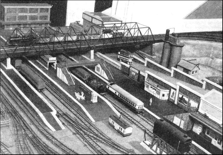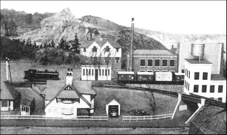 Electricity is, however, the best motive power for H. O model railways, as it is efficient and can readily be controlled. In addition, its use ensures cleanliness—an important point where scenic effects are desired. The scenic side of the H. O gauge has been very carefully studied by the commercial firms supplying the necessary material. It is now possible to obtain sheets of paper, printed and coloured to represent bricks, tiles, stonework, and other surfaces to the same scale as the track and rolling-stock. Thus stations, signal cabins, walls, fences, and buildings of all kinds can be constructed in plywood or cardboard and covered with the paper to give a very pleasing effect—and one that is correct to scale. Suitable pictorial backgrounds of various kinds may also be bought, such as landscapes and seascapes, cloud effects, distant towns. When correctly arranged, these add materially to the realistic appearance of a model railway. This is especially true where the line can be permanently laid in a spare room—preferably on trestles or benches arranged round the walls—the latter serving to support the scenic background. There are literally thousands of these little railways in various parts of the world. The models range from complete systems, with hundreds of feet of track, and locomotives and rolling-stock by the dozen, to single lines with possibly only one engine or coach. The range is infinite and the interest never-ending. A splendid model railway, owned by the Rev. Edward Beal, of Dundee, is built to a track-gauge of 5/8 in. The layout is erected in two top rooms of a house, between which there is a landing 9 ft. wide, a long viaduct spanning this gap to link the two rooms together. There arc about 500 ft. of main line, the track being made up of brass rail soldered to tinplate sleepers, which are spaced at 1/2-in. centres. The power is electric throughout, and the current is supplied by a single outside conductor rail. Electricity is used where it is inconvenient to operate the points by hand. Other points are operated by scale hand-levers. Three companies are represented in this system—the West Midland, the Laurenceton, Methven and Southern, and the Laurenceton and New Elms respectively. Laurenceton, on the West Midland, is the main terminus of the system, and the subsidiary lines in the other lay-out take their name from the fact that they link up train services with this terminus from outlying points. By the adoption of these names it will be seen that it is possible to use the standard lettering, coach finish, and so forth, of the L.M.S. and the L.N.E.R. railways. This is a distinct advantage, when it is remembered that all component parts in this scale are more or less standardized to the British type of railway practice. There are six stations : Laurenceton, Penroddock Docks, and West Oaks on the W.M.R., Glamis and Methven Junction on the L.M.S., and New Elms on the L.N.E.R. The lay-out includes a number of splendid bridge models—a three-span lattice girder across Laurenceton Station, a single-span lattice near Methven, a plate girder near Laurenceton. Other bridges of a smaller type comprise a skew lattice girder near Penroddock, and a plate girder on the industrial extension beyond that point. There are also three gradients, two of which are rather severe, being on the older section. The other is a very gradual one, at 1 in 90, and locomotives will easily haul a ten-coach train to the summit.