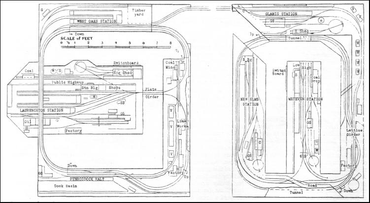 The accompanying plan of the complete lay-out gives all the various details of the respective traffic centres. It will be seen that there are locomotive depots at Laurenceton and at three other smaller stations. The former terminus has a large goods department with a travelling Goliath crane. Methven has a very interesting lay-out, including coal drops located on the high level, and serving lorries below. An outstanding feature is the large dock at Penroddock, which accommodates a large tramp steamer and a paddle-boat, as well as smaller craft. Here there is an all-metal model of a dock crane, all details of shipping and handling appliances being accurately modelled to scale. The vessels in the dock are waterline models, the surface of the basin is composed of sheet glass with a suitably painted surface underneath. At Laurenceton, also, there is a detailed model of a city street, having a motor showroom, a confectioner's shop and the usual station buildings facing it. The station building is designed after the new station at Hastings. The crossovers below the dock, on the main line, as well as the turnout leading from the main line to Penroddock, are electrically operated, which is a great convenience when working at the switchboard on the other side of the room. There are two of these main switchboards, one for each lay-out, yet both so arranged by wiring as to work in conjunction. Each panel is provided with two double throwover main switches. One switch controls the main circuit of current for its own lay-out, the other being an "echo" switch for use with a certain 3-ft. insulated section of the landing viaduct. This short section is wired so as to be dead when the main current in the two rooms is at opposite polarity. The main switch and the echo switch must be thrown over in the same direction, and in both rooms for the trains to be energized when on this short bridge section. If this is not done, the current is out, and the trains stop until it is put in correctly. Thus all crossing of current in the two rooms is out of the question. The arrangement was necessary because the entire system is supplied from one source of power, this being a rectifier charging 8-volts batteries. It is possible to run a number of engines at once. Many of the tracks, particularly alongside station platforms on turn-tables and in engine-sheds, are "dead-alive" sections controlled by closely-set plug-switches on the panels. This arrangement enables trains at one point to be held stationary while others are run at will. Any separate engine can also thus be run out of a shed without disturbing others. Locomotives can be run on to turn-tables, the current being "off," and will thereon stop themselves without further attention until the plug-switch is pulled out.