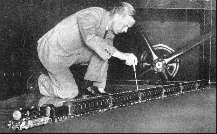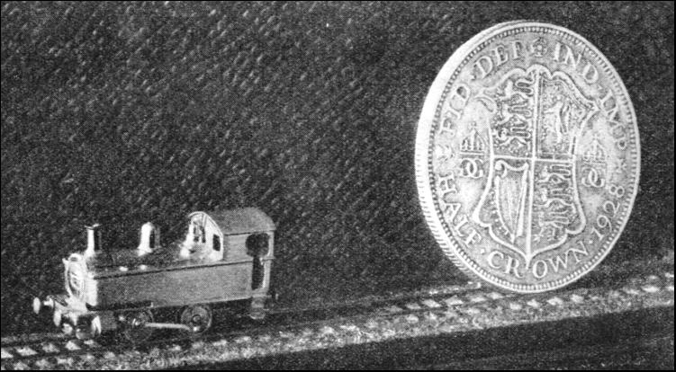 The motive power for Gauge O can be electricity, clockwork or steam. All have been adopted by leading British manufacturers for their standard commercial productions. Coal-fired steam locomotives have been built for Gauge O that will haul two men on a level track. Generally, however, engines for this gauge are fired by methylated spirit or by miniature paraffin or petrol blow-lamps. The next size in model railways is Gauge 1, which may be regarded as a connecting link between indoor and outdoor systems. Splendid scenic efforts are obtainable with Gauge 1 in the garden—miniature tunnels, viaducts. bridges and stations all combining to create a realistic impression, but of sufficiently large dimensions to be appreciated. The space required for a Gauge 1 railway, however, makes it unsuitable for indoors, except in a large house. This gauge is popular for the use of demonstration models at exhibitions and other public functions Gauge 1 locomotives are built as clockwork. electric, or steam models. A coal fired Gauge 1 engine will pull two or three adult passengers with ease. Probably the most popular gauge for outdoor railways is the 2-1/2 in. Coal-fired engines of this gauge are in regular service, all over the world, as passenger-haulers on garden railways. Such locomotives are usually built by the owners in private workshops, and the driving of these miniature machines makes a fascinating pastime, particularly where several hundreds of feet of level track are available. Locomotives for the larger gauges, 3-1/2 in. and upwards, are usually coal fired, and, similar to the 2-1/2 in. engines, are replicas in miniature of the "real thing." The choice of gauge does not, of course, limit the size of the locomotive. In fact, many owners of No. 1 or 2-1/2 in. gauge railways often choose as their prototype a narrow gauge engine. This has the effect of producing a very much larger locomotive in proportion to the gauge—a useful feature where passenger carrying is the principal object of the line. It is, perhaps, due to its constructional side that model railway work owes so much of its attraction. Possibly the field in which the amateur constructor has his greatest opportunity is in the making of extremely small models of locomotives and rolling-stock and components. For many years model railway enthusiasts have been experimenting in miniature representations of locomotives, and they have often vied with one another in an attempt, to produce the smallest locomotive in the world. Undoubtedly one of the most tiny working model locomotives in existence is that constructed by Mr. A. R. Walkley for a miniature railway with a gauge of only three-sixteenths of an inch. This wonderful little model, which runs along a miniature line by electricity, represents a Great Western Railway tank shunting engine as used for dock work. This model is to an exact scale of 1 mm. to the foot, The bodywork was made from thin German silver sheet.