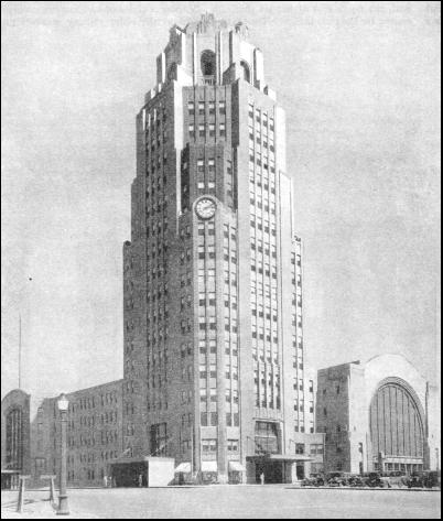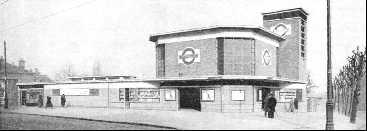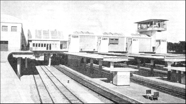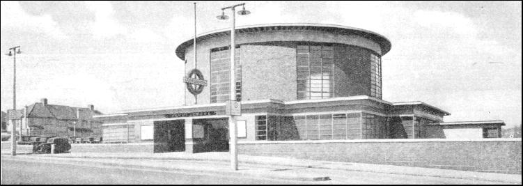 France also provides another fine example of modern architecture in the station at Versailles, the severity of the curved facade being relieved by the arched windows that incorporate double swing doors giving access to the spacious booking-hall. The single span arched roof is glazed in a lace pattern with square and circular panes of glass, giving a pleasing effect. One end wall, above the ticket office windows, displays a huge map of Western France. Facing the entrance doors is a fine clock, without numerals, flanked by rectangular indicators providing particulars of train departures and arrivals. The galleries leading from the booking-hall to the platforms are designed on the same generous lines with walls panelled for the display of artistic posters depicting places served by the station. Many remarkable stations have been built in recent years in the London district to serve the ever-lengthening tentacles of the Underground Railways. Some of these stations are in almost rural surroundings, and the architects have taken every advantage of an opportunity to combine the practical with the artistic in evolving their design. Some fine stations were built on the Southgate Extension of the London Underground Railways, each having similar points in style and decoration but differing widely in general design to suit local conditions. The construction of these stations was carried out in steel and reinforced concrete, with walls of brick. All the concourses are lined with glazed tiles with variations of colour to give pleasant contrasts. A feature of these stations is the provision of a relief shaft, to mitigate the effect of the draught caused by trains entering or leaving the platforms. The station below ground is connected by a shaft to a louvered tower. As a train enters, the air blast is forced up the relief shaft instead of subjecting passengers on the platform to a miniature tornado. Similarly a train leaving the station draws air in through the tower to fill the partial vacuum created underground. An interesting problem arises in connexion with this "suction" effect in the wake of a fast train—nobody can have failed to notice the swirl of paper and dust caused by the flash of an express through a station. With great increases of speed it is probable that station roofs will have to be re-designed to obviate their being damaged by the force of these artificial cyclones.