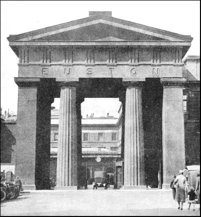 A natural development of the main terminus was the inclusion of the company's administration offices in the station buildings. The use of the single-span arched roof for station work has been a feature of railway architecture for many years. Examples of such roofs are to be found at St. Pancras, Cannon Street and other London stations. Frequently the roof is divided into three arches, as at King's Cross Station, London, and in recent times at Milan, one of the most remarkable stations in the world. In former days a station roof would serve a double purpose—to protect the premises from the weather and also to collect water for use in the locomotives. An interesting example of this practice was the old station at Selby, Yorkshire, built in 1835. This station cost £10,300 to build, and is still in existence, although now used exclusively for goods traffic. In its original form the station comprised a series of sheds over the lines with offices and warehouses adjoining. The trussed timber roofs of the sheds were in three parts, supported on hollow cast-iron columns. It was through these columns that the rain-water for the locomotives drained into underground tanks. Selby Station, together with the Leeds terminus of the old Leeds and Selby Railway, had no platforms or waiting-rooms, and each station served for both goods and passenger traffic. A difficulty experienced by the builders of early railway stations was the necessity for increasing the accommodation at frequent intervals The original Paddington terminus of the G.W.R. was opened in 1838, but by 1845 several additions and alterations had been made. A particularly interesting feature of the first Paddington Station was the building of Bishop's Road bridge immediately behind the station. This bridge formed the station front, and its arches were used as waiting-rooms, booking-hall, and offices. Other arches served as entrances and exits for carriage roads. The goods depot at Paddington lay on the opposite side of Bishop's Road bridge to the original passenger station, which was in use for some twelve years. In 1850, however, traffic had grown to such an extent that plans were put in hand by Brunel, the Great Western engineer, for Paddington Station as it exists to-day. The main portion of the station was finished in 1854, and the total cost of the work was £650,000. The station interior was 700 ft. long with a width of 238 ft., divided by two rows of columns into three spans of 68, 102 and 68 ft. At two points the main building was crossed by 50 ft. transepts, accommodating large traversing frames for moving locomotives or rolling-stock from one track to another. The supporting columns were bolted down to large masses of concrete and the roof was carried by wrought iron arched ribs, covered partly with corrugated iron, and partly with glass. The station of 1854 was in use without extension for more than fifty years. Brunel was assisted in the ornamental details of the work by the nineteenth-century architect. Sir Matthew Digby Wyatt.