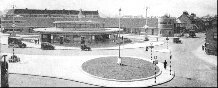 Southgate Station resembles other modern stations on the Piccadilly line, having wide entrances with direct communication between booking-hall and platforms, and well-arranged equipment. The main station building, however, is circular with a wide canopy, above which is a continuous, but smaller, ring of metal-framed clerestory windows. The canopy is lighted from below at night-time by a box-light carried round the building. The concrete roof is supported on small steel columns. A concrete encased steel column supports the centre of the roof, surmounting which is a lantern, topped by a spun copper ball. The lantern comprises a series of concrete rings with glazed bronze frames between them. Lamps behind these windows illuminate the station at night-time. In addition to this lantern, however, there are two illuminated concrete masts that rise from polygonal kiosks on cither side of the station. Each mast carries the bull's-eye emblem of the Underground Railways. Station architecture has in the past conformed as far as possible to the general style of the town that is served by the railway. This is particularly true of such countries as Belgium, where the railway station will often closely resemble the buildings surrounding it. Where a town has a medieval tradition the station buildings will, when possible, be built in the form of a castle, with battlemented walls, even the clock tower appearing as a loopholecl turret. A station with a distinctly medieval aspect is that at Ghent St. Pierre on the Belgian State Railways, where the motor cars in the forecourt provide a striking contrast to the castle-like walls of the booking-hall and administration offices. One of the most notable examples of railway construction that conforms to local tradition is the L.M.S. bridge over the river at Conway. The bridge is built in the same style as the adjacent Conway Castle, and thus harmonises with its surroundings.