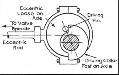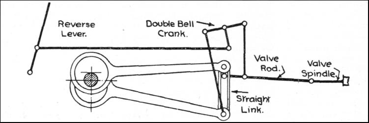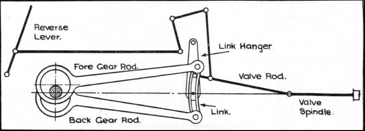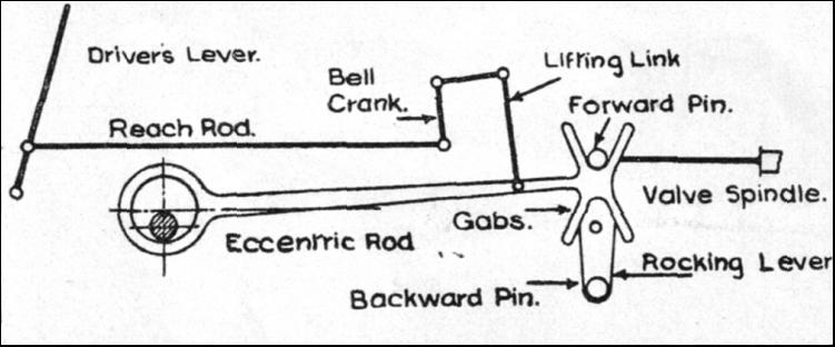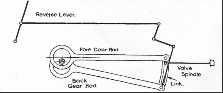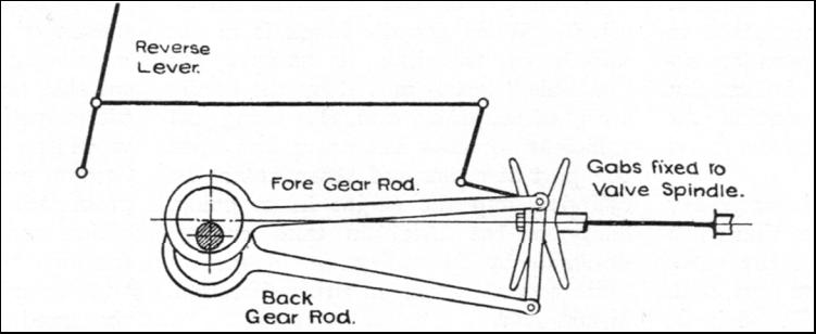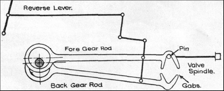 One collar was set to drive the eccentrics for forward, and the other for backward motion, the sleeve carrying the eccentrics being capable of sideways movement, sufficient to allow either pin to engage, by a treadle on the footplate. The "ahead" and "astern" positions of the eccentrics were, of course, exactly opposite, and so the treadle could not be operated unless they were moved half a turn, or the engine moved to suit. The eccentric rods were not therefore directly connected to the valve spindles, but drove them by a hook and pin, which could be lifted out of engagement by a handle on the footplate. To reverse the engine the driver had to move the treadle half-way, lift the pins out of engagement, move the valve spindles by another lever, until the engine began to move backward, and force the treadle right home as the holes in the eccentric plates came opposite the pins in the crank collars—a truly cumbersome way of reversing. It was obvious that a quick reversing gear was essential, and so the single-lever-operated gear came into being.