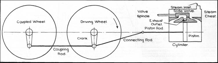 With the exception of a few isolated designs which the railwaymen term "freaks," the driving wheels of every steam passenger and goods engine are turned by crankpins in the wheels themselves, or by a cranked axle, which in turn is operated by one end of a connecting rod, the other end being attached to a piston-rod. This piston-rod is moved back and forth by a piston, which is a disk moving up and down in a circular chamber closed at the ends and called a cylinder. There may be two, three, or four of these cylinders. Steam is admitted and exhausted from either end of the cylinder by a valve, which may be of the slide or piston type. The former is flat, working over ports cut in a flat face on the cylinder casting. The latter resembles a cotton-bobbin, and works in a small cylinder, the ports which admit steam to the working cylinder being formed in the walls. To enable the ports to be opened and closed at the right time for the steam to enter either end of the cylinder, push the piston to the other end, and then escape into the air through passageways and blast-pipe, the valves are moved by a simple system of rods and links called a valve gear. This valve gear fulfils a double purpose. It not only allows for reversing the engine, but the driver can also set it to cut off steam at any part of the stroke of the piston. When a train is running it does not need much steam to keep it going, and a mere puff in each cylinder at the beginning of the stroke is often sufficient. There, in a nutshell, is the whole explanation of the "works" of the engine.