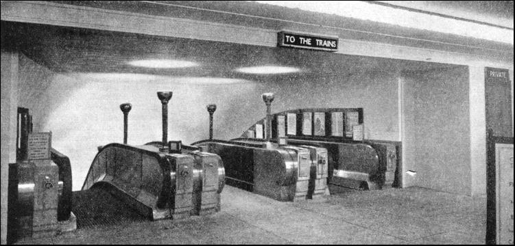 Experimental use has also been made of an automatic device for regulating the speed. This varies from a travel of 90 ft. a minute on the older types to double that rate on the later installations. In normal working the maximum speed of the latter is, however, usually restricted to 120 ft., but the rate is gradually being increased, and 160 ft. a minute is common during the "rush" hours at a number of stations. With the automatic device referred to speed is increased in accordance with the number of passengers. As each person steps on to the escalator he interrupts a ray of light travelling to a photo-electric cell, and this interruption increases the speed. Lifts move at a more uniform rate, which averages between 90 and 100 ft. a minute. There can, however, be no exact comparison between this speed and that of an escalator, since the latter ascends less than a foot with each foot of movement. The basis of comparison between the two is the number of passengers they can handle in a given period, and on this basis victory rests easily with the escalator. Even a short moving stairway can accommodate a greater number of people than a lift; and while the load of a lift has a definite maximum, every movement forward of the escalator uncovers a step available for a fresh passenger or two. Owing to this continuous movement every two escalators can do as much work as five lifts, and the margin will widen as the rate of motion is increased. The escalator represents an improvement both from the point of view of the travelling public, and in facilitating the handling of traffic. But there is another reason for its adoption—the cost of working the lifts, which consume an uneconomical amount of electric current. On one of the London tubes this item at one time amounted to about a sixth of the expenditure on the energy required for traction purposes, and figures more or less comparable were shown by other lines in the pre-escalator days. Another advantage that the escalator possesses is that it eliminates the necessity for providing emergency stairways, since in the event of break-down it automatically transforms itself into a fixed staircase. Station design often involves the construction of long passages between the lifts and the platforms, or between the platforms of two lines served by an interchange station ; it has been found possible on occasions to shorten the length of the resultant walk when the lifts are replaced by escalators. Owing both to variations in station lay-out and to the greatly varying depths at which the London underground tracks run below the surface, it is unlikely that the escalator will entirely replace lifts and staircases. An interesting example of the simultaneous use of the three methods is provided by Baker Street Station, which is three stations in one, since it serves the Inner Circle, the Metropolitan Extension, and the Bakerloo Tube. Access to both the Metropolitan stations is by staircase, and from street level to the Tube by lifts, but communication between the Tube platforms and those of the Extension Station is by escalators. Here, each of the three methods is admirably adapted to its special requirements.