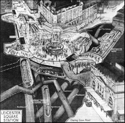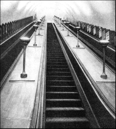 Speed is controlled by a governor, similar in general principle to that used on stationary steam engines. Two heavy metal balls are attached to pivoted levers which are in turn fixed to a vertical shaft, revolving through gearing. The faster the shaft revolves, the more are the metal balls swung out by centrifugal force, and should the lift speed exceed a predetermined figure the governor actuates a brake. This device was originally designed to serve as a check on the working of lifts controlled by an attendant travelling on them. In the newer types, no attendant is necessary in the lift itself, as the result of introducing a semiautomatic means of operation known as landing control. With this system, human control is restricted to closing the gates, after which working, including acceleration and deceleration, is automatic. The advantages of the method are that it saves the passenger's time, and that a single operator can attend to a number of lifts. At certain stations the lift is operated at the upper level by the booking clerk, and an attendant is necessary only at the bottom of the shaft. Underground station design varies so considerably (for instance, the up and down platforms are not always on the same level) that uniformity in the design of lift shafts has been out of the question, but wherever possible a single shaft accommodates two lifts. Apart from the saving in constructional costs, the arrangement is valuable in the event of breakdown ; should one lift stop through mechanical defect or breakdown, the second lift is brought alongside, and passengers are transferred through the emergency doors at the side. The existence of these doors is probably unknown to the majority of travellers, since the doors are normally concealed by the advertising panels. In this connexion, it might be pointed out that in general the public has but little knowledge of the steps that are taken to make railway travel safe. The break-down of a lift is, as a rule, due to some minor mechanical defect that can be put right in a relatively short time. To provide for a complete break-down that is likely to take long to remedy, a special hand-winding gear is installed to bring the lift to the top of its shaft in a few minutes. This is a rare contingency—the winding gear has not been used twenty times in the whole history of the London Underground system. Although the application of escalators to railway purposes came later than the use of lifts, the escalator has a longer history than is generally imagined. Its principle is that of an endlessly moving way, running at slow speed, and in one primitive form it had no vertical lift, but moved horizontally. The use of such moving ways has from time to time been suggested as a substitute for trains, especially on underground lines. Various ingenious schemes have been devised for building a series of such travelling platforms, each running at a different speed, so that passengers could first step on to one that moved forward at, say, three miles an hour, and end up on a fourth way geared to four times that speed ; this procedure to be reversed when alighting at stations. These projects have not, however, been put to practical use. An escalator was in use at the Earl's Court Exhibition over thirty years ago. By a remarkable coincidence, the first escalators in the service of London transport were installed at Earl's Court Station, where they were inaugurated on October 4, 1911. In the following year they were introduced at the Central London's Bank Station (the first to have three in one shaft). Since then it has been the general practice to equip all new stations below ground with escalators, and to substitute them. for lifts when a station is reconstructed, as has been done, for instance, at Chancery Lane, Holborn, and Piccadilly.