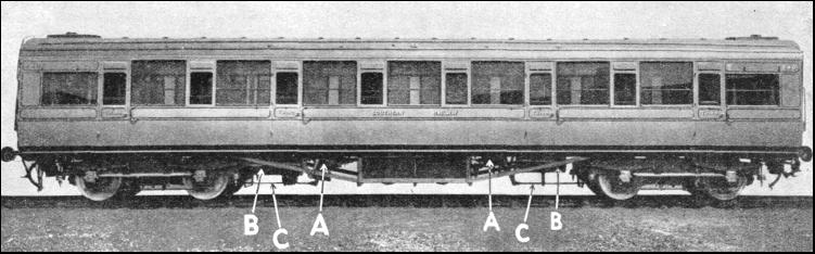 The locomotive was fitted with an "ejector," consisting of a casing containing a cone with a steam nozzle at the back of it, steam being supplied from a valve on the boiler backhead. The rear end of the cone was connected to the train pipe via the driver's valve, which acted the same as a three-way cock, one position connecting the train pipe with the ejector, and the other position cutting off this and opening the train pipe to the atmosphere. When the driver wanted to apply the brakes, he opened the steam valve, and placed the brake valve handle in the first position. Steam blew through the cone and took the air from the train pipe with it. This mixture went to the smoke-box and chimney through a large pipe attached to the front end of the cone. To release the brakes, steam was shut off, and the handle placed in second position, admitting air to the train pipe and destroying the vacuum. When the air was drawn from the train pipe by the ejector, the pressure of the atmosphere would close up the "concertinas" and so exert a pull on the brake rods. With air in the train pipe, pressure was equal inside and outside the "concertinas," and the brakes would either release themselves or else be pulled off by release springs, as in the case of the air brake. The vacuum brake, in this primitive form, underwent several improvements ; the steam and brake valves were combined, so that the brakes could be applied or released by movement of one handle only. Various details were made better ; but the brake as a whole suffered from drawbacks similar to those of the "straight" air brake. If anything happened to the ejector or apparatus on the engine, or if leakage occurred in the train pipe and connexions, the brake could only be applied with reduced power, or not at all. It was sluggish in operation ; also—most important of all—if a train broke in two, or a hose was torn apart by accident, the brakes on the entire train were put out of action. Again, as in the case of the air brake, one small gadget added to the brake cylinders reversed the action of the brakes, and made them automatic. This was nothing more formidable than a simple ball valve, located at the point where the connexion from the train pipe was attached to the brake cylinder. The brakes were now "off" all the time a vacuum was maintained in the train pipe ; and as soon as air was admitted, either by the driver, guard, or by accident, the brakes were automatically applied, the action being as follows : When the engine was coupled on to the train and the driver opened the ejector steam valve, the air was extracted from the train pipe, but this did not apply the brakes, as air was taken from both sides of the pistons in the brake cylinders, leaving them in equilibrium, or "balanced." And as long as the pressure or vacuum on both sides of the pistons remained equal, the brakes stayed in the "off" position. Air was drawn by the ejector from the undersides of the pistons direct ; but to get from the upper side of the pistons, the air had to lift the ball valve and pass through it.