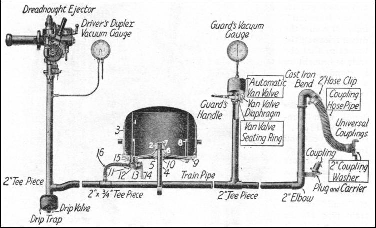 In this apparatus, shown by the illustration above, a piston is held in place by the vacuum in the train pipe, and this in turn maintains a steam valve on its seating against the pressure of steam in the boiler. When the brake is "off," the effect of the vacuum on this piston resists pressure of the steam. But when an application of the brake is made the power of the piston is reduced, and steam rushes through the valve, previously closed by the piston, and enters the steam brake cylinder, so applying the engine brakes to the wheels. When the vacuum is restored in the train pipe the steam is allowed to escape from the brake cylinder, which at the same time is shut off from the main steam supply of the boiler. The partial application of the vacuum brake also ensures a partial application of the steam brake, so that the locomotive shall be retarded in equal proportion to the train. The vacuum automatic brake is also used on electric trains on certain railways, the vacuum being created by an exhauster, driven by an electric motor.
