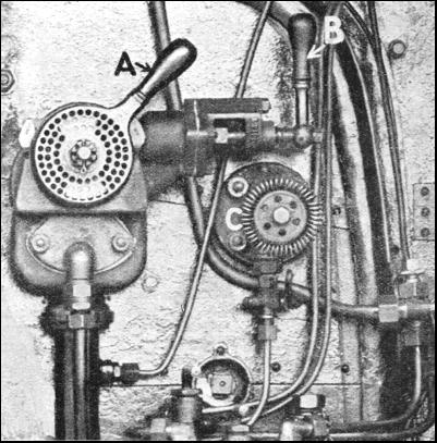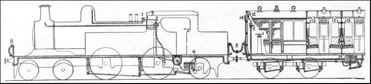 Uncoupling is easily accomplished by lifting the two fittings apart. The last hose-coupling on a train is placed over a "dummy" or flanged stopper, which effectively seals the end of the train pipe. A similar fitting is used on the front of the engine. In some instances couplings are used with extra long lugs, provided with a chain and pin. Where vehicles of differing types, for example, are to be coupled together, the position of the flanged castings would not be at the bottom of the "U" formed by the hoses, but the pin through the lugs holds the flanges in close contact, despite the fact that they are hanging nearly vertically. Another very interesting type of coupling is that used between an engine and tender. This coupling is placed on the auxiliary pipe between the engine and tender, and retains the automatic action of the brake in the event of the locomotive being accidentally separated from the tender when running. Each half coupling is fitted with a ball which, when the coupling is together, is held off its seating by means of a protruding peg on the other half. Should the engine break away from the tender, these balls are forced on to their seatings by the inrush of air, and the pipes thus become sealed. The application of the vacuum brake to a locomotive has been illustrated early on this page, but under modern conditions it has not always been practicable to make use of this system. In certain instances there is not sufficient room on a locomotive for a brake cylinder large enough to be effective, and consequently a brake is employed which is operated by steam at the full pressure of the boiler. It is generally the custom to make use of the vacuum brake for the train and the steam brake for the locomotive. The two systems are used conjointly, and their action is simultaneous. This is effected automatically by means of the control gear of the vacuum brake, which also governs the action of the steam brake on the locomotive. The ejector in the locomotive cab, which controls the vacuum brake on the train, is fitted with a special valve automatically controlling the operation of the locomotive steam brake.