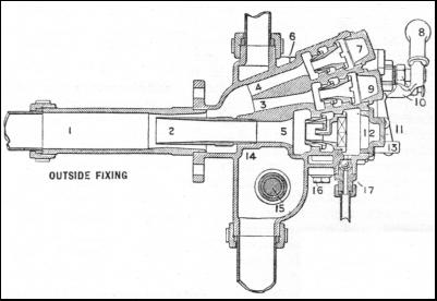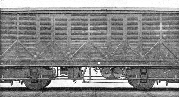 Another kind of "sack" is used in a horizontal position under the carriages, similar to air brake cylinders, and contains two diaphragm pistons. The space between them is always under vacuum ; to apply the brakes, air is admitted at both ends. Sometimes the piston-rod, instead of passing through a gland, is covered by a piece of flexible hose, tightly clamped to both the piston-rod and the boss on the cylinder cover through which it works. When the brake is applied, and the piston rod is drawn into the cylinder, the hose wrinkles up like a closed concertina bellows. Some brake cylinders are fixed, the piston-rod being connected to an arm on a cross shaft under the vehicle, and connexions are made between other arms on the shaft and the brake pull rods. Another form of brake cylinder, called the "crab," has the piston-rod directly connected to the longer arms of two bell cranks on the cylinder itself, the short arms of the bell cranks being attached directly to the brake rods, dispensing with the cross shaft. The cylinder, being mounted on trunnions, can swing and adapt itself to the rods, rendering the gear self-compensating. The guard can apply the vacuum brake from his van, the valve being of the lift type in a casing, and operated by a handle which unseats it to admit air to the train pipe. This valve also has an automatic action which assists the driver to make a quick stop in emergency. The casing above the valve is under vacuum, as it communicates with the train pipe through a small hole in the valve stem ; consequently a rush of air into the train pipe acts against the underside of the valve, as it acts on the piston of the brake cylinder, lifting it against the vacuum in the casing. Air then rushes in and helps to apply the brakes quickly. On some lines where slip coaches are used, a special arrangement is provided whereby the guard can apply and release the brake as well, so that he can stop the slip portion of the train at the required part of the platform. Passengers also can stop a train if necessary. The passenger alarm signal is directly connected to the brake gear, so that anyone wishing to stop the train in emergency begins to apply the brakes. A small pipe connects the train pipe with a valve box on its end of the coach near the top, the valve consisting of an India-rubber seated flap-valve, which is lifted by a rotating shaft passing across the end of the coach. The alarm chain is attached to cranks on the ends of the shaft, which also carries indication disks. If a passenger pulls the chain, the flap-valve is opened and air is admitted to the train pipe, beginning the application of the brakes; at the same time the indication disk turns to a vertical position and shows from which coach the alarm was given. The train is finally brought to a standstill by the driver or guard. Every brake system must necessarily present difficulties, and many ingenious devices have been invented and perfected by railway engineers to ensure reliability of the vacuum brake under all conditions.