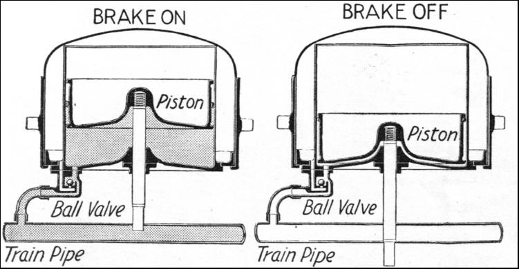 As there is only this comparatively low pressure available to work the brakes, the brake cylinders have to be much larger than those used in compressed-air brake systems. A section of the usual type of cylinder is shown below. The whole is made of thin cast or pressed metal, the working cylinder being covered by a dome-like casing which serves as a vacuum chamber. Its purpose is to increase the space above the piston The piston is hollow and very deep, and contains a long packing groove in which is a big rubber ring, of circular section ; a glorified edition of those used to seal preserved fruit jar caps. As the piston moves, this ring rolls between piston and cylinder, and forms a perfectly airtight yet practically frictionless packing. The piston-rod passes through an airtight gland in the cylinder cover. Some brake cylinders, instead of having the vacuum chamber self-contained, are provided with a separate chamber. The chamber is merely a large cylindrical tank, similar to an air-brake auxiliary reservoir, except that it is lighter. It is directly connected to the upper part of the brake cylinder by a suitable pipe. Other types of brake cylinders are in use. One kind does not use a rolling ring nor a ball valve ; the ring is replaced by a rubber band operating in much the same way as a cup leather on a cycle-tyre inflator. Six holes are made in the piston head, and when the vacuum is created in the train pipe, air is drawn through these holes and passes the rubber band. Another type dispenses with the deep cylindrical piston, and in its place has a flat disk which is clamped to an India-rubber diaphragm secured between the flanges of the two halves of the cylinder, very much after the style of the piston and diaphragm (known as a "leather hat") of a village pump. The diaphragm being flexible, the piston can move up and down the cylinder, yet no air can pass except by way of the valve. This type of cylinder is known to railwaymen as a "sack."