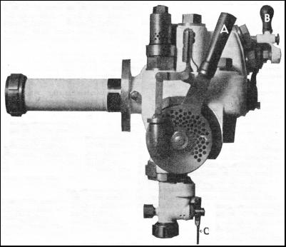 To apply brakes, the driver pulled back the handle of the brake valve, which first cut off steam from the ejector, and then admitted air to the train pipe. This rushed along to the undersides of the pistons, but was unable to get into the space above them, as it forced the ball valves down on their seats and held them there, effectually barring its own passage. Pressure on the undersides of the pistons now being greater than the pressure above them, they were forced upwards ; and the rods being coupled to the brake gear through the usual pull-rods, the brakes were applied. The same thing happened if the train broke in two, or a hose became damaged in any way, so that air was admitted to the train pipe. This is the action of the automatic vacuum brake, as used to-day, except that, to speed up its action on long trains, air can be admitted at various points in the train pipe by means of rapid-acting valves or "accelerators," and also through the guard's emergency valve. If a train is left standing in a station or siding with the brakes on, and there is no engine attached, the brakes can be released, if necessary, by what railwaymen call "pulling the strings." The "strings," or wires, are attached to a small valve on each brake cylinder, which admits air from the lower to the upper side of the piston, destroying the vacuum, and thus equalizing the pressure on both sides of the piston. It will be seen from the above description that to operate the vacuum brake on a train of modern weight and length, an efficient ejector is needed to extract the air with the utmost rapidity from the train pipe when releasing the brakes, and to maintain the vacuum while running, as there is always a certain amount of leakage at hose connexions and other places. About the best known is the "Dreadnought" type. This ejector is fixed either on the right or left hand side of the cab, according to which side the driver stands. It consists of a gun-metal casting, with steam and air cones in it, and union fittings for connecting up to the steam, exhaust and train pipes. On one side of the casting is a large perforated disk, fitted with a handle. The underside of this has ports which register with other ports formed in the seating. There are three positions of the handle, "brake off," "running position," and "brake on."