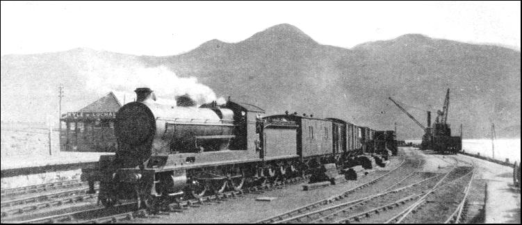 Hereafter the line takes its snakelike course down through the flanking hills, past Tulloch, past Loch Treig, with its inky waters and with the great dams of the Lochaber hydro-electric works at the foot, until it reaches Roy Bridge, where the rivers Roy and Spean converge. As if to make up for the terrible bleakness of Rannoch Moor, Glen Spean, through which the line makes the rest of its way to Fort William, is lusciously verdant, thick trees overhanging the precipitous gorge of the turbulent river all the way. The railway itself twice crosses the River Spean, which resembles a long continuous waterfall. Near Spean Bridge station is the bridge whence the station takes its name, and where, in 1745, two companies of Government troops were routed by eleven Highlanders and a piper. Ben Nevis, the highest mountain in the British Isles, now comes into clear view on the left-hand side of the line. At Fort William is the busy atmosphere of a small town contrasting strangely with the solitude through which the train has passed. The fort itself, built originally to "pacify" Highlanders such as those who held Spean Bridge, is now a flattened mound, encompassed by thick walls, and containing, together with a group of cottages, the L.N.E.R.'s turntable and engine shed. The station is built on the margin of Loch Linnhe, close to the steamer pier where the connecting steamers come in from Oban and Ballachulish.