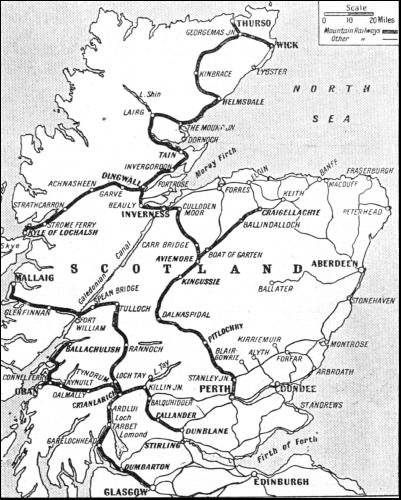 The Kyle of Lochalsh is to the Outer Hebrides and Skye what Dover is to France, or Harwich to the Netherlands. But unlike an ordinary transhipment point, the port is beautifully situated. It is connected by steamer service with Mallaig as well. Mallaig is only twenty miles away as the crow flies, but if anyone were foolish enough to try to reach it by railway from Kyle of Lochalsh, he would have to travel down to Perth, then across to Balquhidder and Crianlarich, and finally up the West Highland Line—a distance equal to a journey down into England. Similarly, the towns of Tain and Dornoch are only about five miles apart, on opposite shores of the Dornoch Firth, but they are forty-five miles apart by railway. The final section of the old Highland Railway continues northwards from Dingwall, creeping round the coast by Invcrgordon and Tain to Bonar Bridge Thence it strikes inland and enters the hills at Invershin. From Invershin there is a sharp ascent to Lairg along the eastern side of the valley of the river Shin. The hillside is so steep in one place that a great shelf of masonry had to be built to take the railway. As the train travels along this shelf, it seems almost possible to drop a pebble into the foaming waters of the river, far below in the gorge. From Lairg, the line bears back to the coast again, and at the Mound Junction, it is joined by the branch line from Dornoch, which crosses Loch Fleet on Telford's famous causeway. Then the North Highland line pursues a relatively uninteresting course along the shores of the North Sea to Helmsdale. The final mountain section ensues when the line once more turns its sinuous course inland and makes a wide circuit over the moors of Sutherland and Caithness. The mountains here tend to be isolated rather than to run in ranges, and the country is wild and bare in the extreme. The rails reach an elevation of 708 ft. between Forsinard and Altnabreac. Snow fences and queer-looking snow-blowers are frequent, for this section has the same bad reputation as Dava Moor and Rannoch. As with the line over Rannoch Moor, its construction was considerably hampered by spongy and apparently bottomless bogs. In Caithness the mountains are finally left behind, and the line runs to its termini at Wick, Lybster (the uttermost station in the country), and Thurso. Thurso, opposite Orkney, is the northernmost railway station in Great Britain. The remaining Scottish mountain railway runs from Callander, near Stirling, to Oban and Ballachulish. It was built by an independent company, but was always worked by the Caledonian Railway, as the predecessor of the present L.M.S. Railway. The Callander and Oban Railway is second only to the old Highland lines in seniority ; it dates back to the seventies, long before the West Highland Railway was projected. Callander is situated in a natural gateway to the Highlands, not far from the famous Trossachs district. It is a place of great antiquity, like Dumbarton and Dunkeld, and was besieged by the Romans in A.D. 85. It is now an eminently respectable place, but less exciting. From Callander, the line winds up the steep-sided Pass of Leny, with its brawling river and the crooked Loch Lubnaig, and reaches the first station along its route at Strathyre. From the next station, Balquhidder, a line diverges for Perth, passing through Comrie and Crierf. The Oban train, toiling up the hillside from Balquhidder, is now in the heart of the Rob Roy country. It emerges high above Loch Earn. Far below, skirting the shores of the loch, the Crieff line with its viaduct and station at Lochearnhead, looks like a very tiny and very beautiful model railway. Bearing north-west, the Oban line now enters wild and rocky Glen Ogle, in the midst of which, on the left-hand side, may be seen the remains of what must have been a terrific avalanche. It looks as if a part of the mountain had been scooped up and shot down the slope. Great precautions are taken against falls of rock along this section, and a system of electric contacts ensures an immediate alarm should anything endanger the railway line. At Killin Junction, for the Little Killin and Loch Tay branch line, we have passed from Glen Ogle into Glen Dochart. Both Glen Ogle and Glen Dochart have engines named after them, but curiously enough they belong to the L.N.E.R. and work on the West Highland line. The line now runs along Glen Dochart, past Loch Tubhair twinkling beneath Ben More, to the now familiar station of Crianlarich. The L.M.S. station is below that of the L.N.E.R., and at right angles to it. Leaving Tyndrum, the Oban line skirts the lower slopes of Ben Laoigh and runs southwest to Dalmally, a lovely place at the foot of Glen Orchy. Now, on this final stretch, as with the West Highland and Skye lines, comes the most strikingly beautiful country. The Oban line passes along a narrow strip of land bounded on the one side by the wide expanse of Loch Awe and on the other by the precipitous side of Ben Cruachan. The loch narrows into the deep Pass of Brander. The train then passes through Taynuilt and Ach-na-cloich, beside Loch Etive, and reaches the junction of Connel Ferry, whence the Ballachulish line diverges northwards. Oban is finally attained by a steeply descending horseshoe curve.