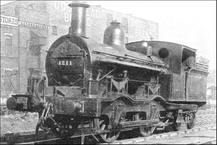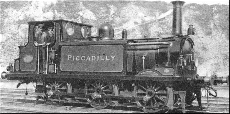 These underground locomotives deserve special mention, because the designers had to solve a novel problem . that of eliminating, or at least reducing, smoke in the tunnels, which was effected by means of a condensing apparatus. Its operation consisted in diverting the exhaust steam from the blast pipe into another pipe. From here it passed into the top of the tank. where it could be discharged on the surface of the water. This resulted in only the upper layer of the water in the tank being heated, and the smaller pipe with an open upper end was added in consequence. The upper end was extended into the orifice of the larger pipe, while the lower end, which was also open, entered the tank. Enough steam then found its way into the smaller pipe to secure circulation of the water. As originally constructed in 1864 (only a year after the opening of the Metropolitan, which was at first worked by Great Western broad-gauge tanks and then for a short period by standard gauge London and North Western and Great Northern stock) the tanks had a capacity of 1,000 gallons, but this was increased in the later engines to 1,140. A similar type was used by the District, 120 engines being constructed for the two companies. They had no cabs. The dome was placed unusually close to the chimney ; the tank traversed the greater length of the boiler and extended along most of the footplate. The outside cylinders were slightly inclined. The use of these engines was not confined to the two Underground companies, since the North Western, South Western, and Midland had at one time a total of twenty-eight between them. A few were also made for Germany. Some of the Metropolitan and District tanks are still running in various parts of the country.