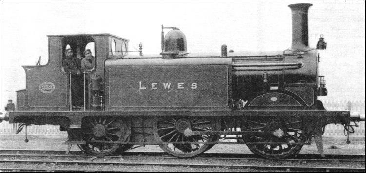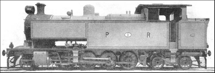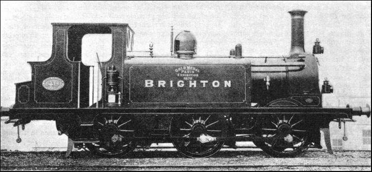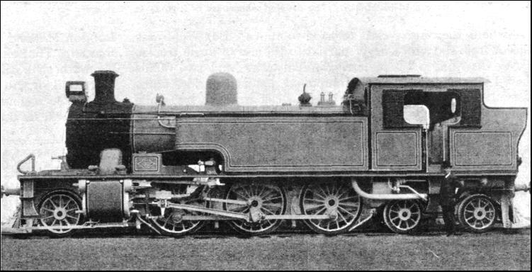 It should be mentioned that these bogie tanks were not the first to be fitted with condensing apparatus for underground working. The broad-gauge locomotives, designed by Gooch, with which the Metropolitan was inaugurated, were outside cylinder 2-4-0's. They also had a condensing device. This was unsatisfactory, partly because the system had the defect of drawing water into the cylinders when steam was cut off, and partly because of the difficulty in keeping watertight the automatic valves fitted to the exhaust pipes for the purpose of preventing that contingency. The result was that it often became necessary to use the normal chimney exhaust. The eight-coupled tank is sometimes regarded as of modern or relatively modern origin in this country, but the design originated so far back as 1864 on the little Vale of Neath Railway, and was two years later adopted by the Great Northern. These were the most powerful British tanks of their day, the Vale of Neath engines having a total heating surface of 1765.8 sq. ft.; while those of the Great Northern, which were equipped with condensing apparatus for through working on the Metropolitan, had 1,550 sq. ft. Two celebrated tank types of a later period, associated with the name of Stroudley, of the Brighton Railway, are not only known to all students of locomotive history, but survive to this day. These are, respectively, of the 0-4-2 and 0-6-0 types. The Brighton 0-6-0's were the famous "Terriers," probably the most powerful locomotives of their size that ever ran on any railway. Fifty were built between 1872 and 1880: The chief reason for their small dimensions was to be found in the light rails (made of iron and not steel) over the sections for which they were originally designed. Their total weight in working order was only 24 tons 12 cwt., which was equally divided between all three axles. The heating surface amounted to the modest figure of 528 sq. ft., and the tank capacity was 500 gallons. One of these engines, the "Brighton," won a Gold Medal at the Paris Exhibition of 1878. Incidentally, this locomotive became famous ; while in France it was tried over a short distance on a French train, and its performance induced the then Western of France Railway (now part of the State system) to accelerate some of its services.