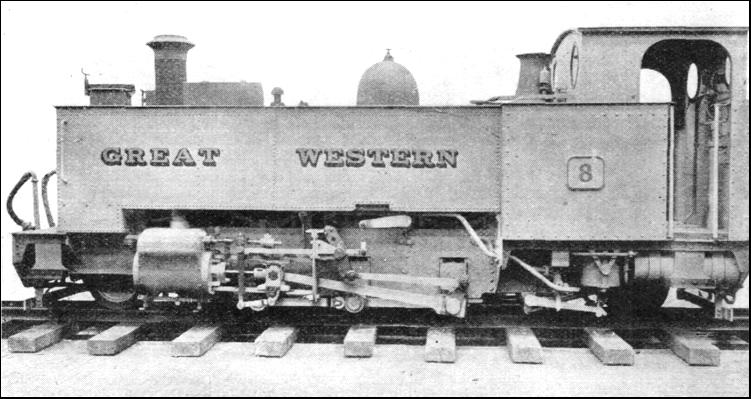 Indeed, during the 'thirties and the next ten years there was, in England, quite a vogue for the locomotive with a tender at either end. One reason why the tender type came first may have been that the early British locomotives used coke, while wood was largely employed in the United States, Russia, and other countries ; both these forms of fuel occupy more space in relationship to their weight than coal. Furthermore, the design of even the most primitive water storage tank called for greater ingenuity than that of the early tenders, in which the water supply was kept in a barrel mounted on a simple four-wheeled truck, on the lines of the eighteenth-century chaldron wagon. One of the earliest, if not the earliest, types of tank engine built in England was a series of Great Western broad-gauge saddle tanks, designed by Gooch, of which the first were at work in 1849. These engines were eight-wheelers (of the 4-4-0 wheel arrangement), and followed in general design the best express locomotive practice of the period, and were, incidentally, noteworthy as being early English examples of the four-coupled bogie type. The bogie, which was of spring suspension type, remained, with minor modifications, standard Great Western practice until the abolition of the broad gauge in 1892, and the wheel arrangement of these tanks was adopted by Gooch in his "Coeur de Lion" tender express class in 1855.