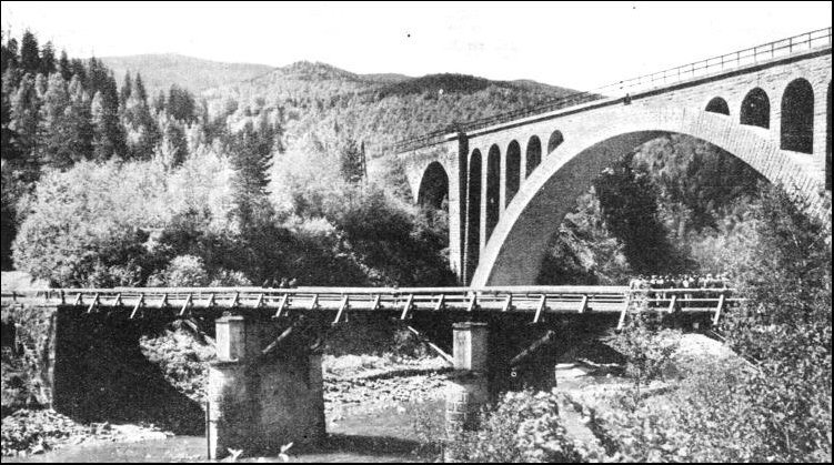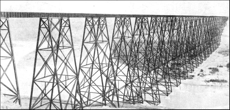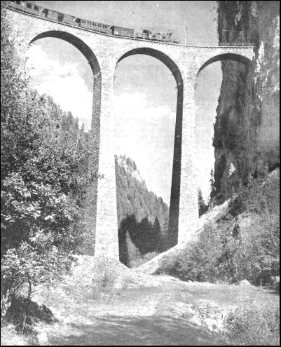 One of the most striking journeys in Europe for the lover of great viaducts is that provided by the narrow-gauge South of France Railway from Toulon up into the Maritime Alps at the back of Nice and Grasse. The line twists and turns along the face of the mountain range, and, wherever a deep glen opens its mouth, there is a great stone viaduct. A typical and splendid example is the viaduct spanning the Loup River at Font du Loup. The South of France Railway (Ligne du Sud de la France) should not be confounded with the former Southern Railway of France, known as the Midi, now amalgamated with the Paris-Orleans. On the last-named line, in Puy de Dôme, is the highest viaduct in the world. This is the Fades Viaduct, the central 472 ft. span of which is 435 ft. above the river. Switzerland has many notable viaducts, and here again they are remarkable for their height above the valleys they span rather than for their length. The Landwasser Viaduct, on the Rhaetian Railway, 426 ft. long. has its central span 213 ft. above the valley, while the Solis Viaduct is 292 ft. above the river. Though not, strictly speaking. a viaduct, the Ponte di Melide, in the extreme south of Switzerland, should be included, since it carries trains. It is a causeway, containing a few spans to allow for the movement of the water, built across the Lake of Lugano at the foot of Monte San Salvatore. It carries the main line ot the St. Gothard Railway, connecting Zurich with Milan via Chiasso. A similar causeway carries the L.M.S. Railway's Dornoch branch across Loch Fleet in Sutherland. This latter was built by the great Thomas Telford before the days of railways, the railway line having been added during the present century. On the North American continent we find many splendid viaducts, one of the best known being that at Lethbridge, just under 760 miles west of Winnipeg on the Canadian Pacific Railway. It is of trestle construction, but it is built of steel instead of iron. At one point the rails are 314 ft. above the river below. The trestles consist of thirty-three steel towers, and the total length of the structure is 5,327 ft. The Lethbridge Viaduct, like most big trestles, is a striking rather than a beautiful piece of work. Generally speaking the American viaducts, big and finely designed as they are, cannot compete with those of Europe in the matter of good appearance. The United States contains two of the most extraordinary pieces of railway viaduct construction in the world. One of these is the Lucin Cut-Off, which, by alternate embankment and trestle-work, carries the Union Pacific across twenty-seven and a half miles of the Great Salt Lake, Utah. The lake, vast as it is, is relatively shallow all the way, and the building of the cut-off was a matter of time, money, and perseverance rather than superhuman battling against the elemental forces. The same applies to the Key West Extension of the Florida East Coast Railway, which again, by means of alternate embankment and viaduct, crosses 114 miles of the Gulf of Mexico.