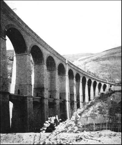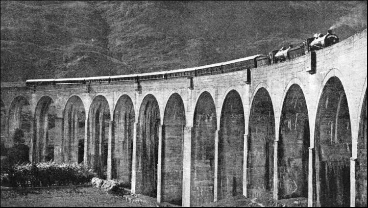 The entire structure has a length of 1,800 ft., and the height above the river bed is 135 ft. The Highland main line abounds in fine bridges and viaducts, and another, which is well known, though relatively small, occurs in the world-famous Pass of Killiecrankie. Probably the reason for its popularity is the fact that it fits in perfectly with its beautiful surroundings and, moreover, is a good subject for amateur photographers. Other notable L.M.S viaducts in Scotland include the Ballochmyle Viaduct in the heart of the Burns country, with its i8o-ft. arch, and the Broomhill Viaduct at Larkhall, the highest in Scotland. In England, the L.M.S. is poorer in viaducts than the L.N.E.R., though there are fine structures here and there, especially on the Midland Division, such as the famous Monsal Dale Viaduct in Derbyshire, which, like the Killiecrankie Viaduct, owes much of its fame to fine surroundings. The Great Western Railway used to be especially noteworthy for the wooden viaducts designed by I. K. Brunel and built across the deep valleys of South Cornwall. After Brunel's death in 1859, their replacement by more orthodox erections was begun, for they had their disadvantages even in those days; but the last of them—on the Falmouth branch—carried its last train only a year or so ago. The North Eastern also had a big wooden viaduct, at Knitsley, in the Lanchester Valley. This example resembled very closely indeed the typical American trestle, beloved of "Wild West" story-tellers. It is in Wales that we find the best of the Great Western viaducts, and among these are the Crumlin Viaduct and the Dee Viaduct at Cefn. The Crumlin Viaduct is a trestle structure situated between Pontypool Road and Pontllanfraith. It was opened for traffic on June 1, 1857, at which time it was the largest viaduct in the world. It crosses the Ebbw Vale at a height of 200 ft., and is formed into two sections by a queer intervening hill dividing the valley. The main section, on the east side of this hill, is 1,066 ft. long. The Dee Viaduct at Cefn is of stone, and contains nineteen 60-ft. spans, the deepest arch being 148 ft. above the river. Older than the Crumlin Viaduct, this also had in its time the reputation of being the greatest in the world. When we reflect on the fact that Great Britain, except in the west and north, is not a mountainous country, and that even so it contains so many big viaducts, it will be realized that it is impossible to do justice to all the great viaducts of other lands, many of which are exceedingly mountainous. It will be possible, therefore, to mention only a few outstanding examples. Though the Tay Bridge held pride of place among the world's viaducts until the Lower Zambesi Bridge was built, the Stone Upper Bridge of the East Indian Railway runs it close. The frequent flooding of the rivers in India has necessitated the construction of ninety-three spans, with a total length of 10,052 ft., 727 ft. shorter than that of the Tay Bridge.