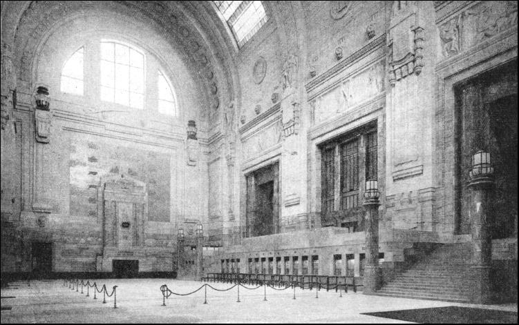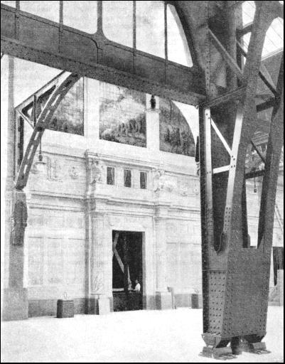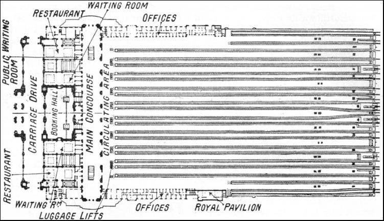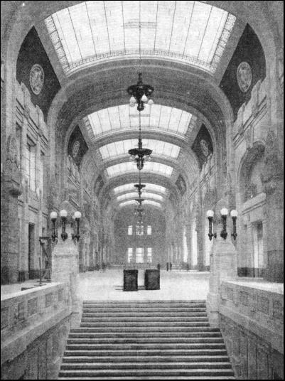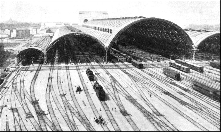 The station building is horseshoe-shaped and consists of a main block and two wings 500 ft. long extending towards Via Sammartini and Via Apporti. The building faces the Piazza Andrea Doria, one of the largest squares in Italy. Piazza Andrea Doria is large enough to contain St. Peter's Square in Rome. The façade is adorned with a stupendous colonnade, 607 ft. long, 79 ft. wide, and 90 ft. high. This colonnade is reserved for vehicular traffic ; to prevent any congestion, the carriage-way is divided by a broad, raised footway running across its centre into two sections for incoming and outgoing vehicles respectively. The projecting central portion, forming the portico, is designed merely for effect ; with its three huge portals, 29-1/2 ft. wide and 53 ft. high, it gives an imposing aspect to the whole façade. The statuary groups on top of the portico are remarkable for their beautiful conception and execution. The carriage-way receives tight through the glass roof and through the wide front windows. Adjoining the carriage-way is the large and magnificent booking hall. It has a length of 209 ft., a width of 110 ft., and a height of 138 ft. The hall presents a striking appearance with its glass-covered roof, its leaded windows, its wealth of many-hued marble, its grand staircases, and its sculptures. The lower part of the walls is lined with green Roia marble, while the upper part is laced with mellow polished travertine—the famous building stone used for the Colosseum, St. Peter's, and other renowned buildings in Italy. The decorations are few and restrained ; their purpose is to break the vastness of the walls, and to set at rest the mind that loses itself in the seemingly endless space. Six panels beautifully sculptured in relief are fitted into the walls, to enliven the otherwise monotonous effect of the long polished surfaces. The panels represent famous episodes from the history of Rome. The huge candelabra flanking the staircases are of an especially striking design. The twenty-four ticket offices are situated along the wall facing the main entrance, between the two staircases. At either of the narrow sides of the hall are passenger lifts. Two luggage halls, each of 148 ft. by 49 ft., are situated at either side of the booking-hall. Here also the walls are faced with Roia marble and polished travertine. On one side of the hall the incoming, on the other outgoing luggage is handled, so that no confusion can arise. Powerful luggage lifts convey the luggage to and from the luggage halls to the platforms.
