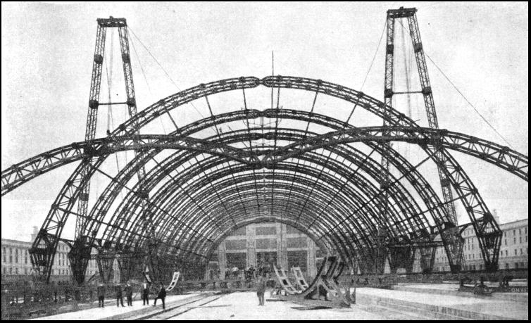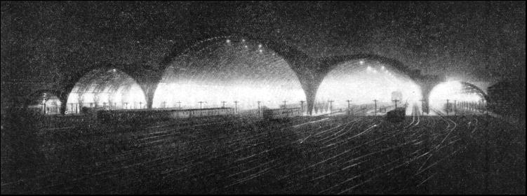 The length of the platforms is 1,051 ft., with the exception of two at either side, which start at the extremity of the wings, and are only 591 ft. long. Imposing in its size is the platform roof, which covers an area of 80,000 Square yards. The roof is composed of five bays of three-hinged steel arches. The centre bay has a span of 236 ft., the span of the bays at either side is 147 ft., and that of the two outer bays is 39 ft. in the part confined by the wings, and 69 ft. beyond them. The total weight of the steel structure is 9,400 tons, each single arch of the centre bay weighing eighty tons. The arches rest on thick steel plates, placed upon granite bedstones 32 in. thick. These granite blocks measure 3 ft. 3 in. by 6 ft. 6 in. in the centre bay, and 3 ft. 3 in. by 5 ft. 7 in. in the other bays. The total length of the roof is 1,120 ft. The height from the platform to the crown is 110 ft. in the centre bay : 72 ft. 3 in. in the side bays, and 37 ft. 9 in. in the outer bays. Almost half the roof is covered with glass panels, the remaining part with reinforced concrete slabs. Ventilation is provided by two series of glass covered lunettes, while smoke uptakes at the crown of the arches have been installed. In the side bays a number of electric fans draw the smoke upwards through the uptakes. The wings of the building contain, at the platform level, on the side of Via Sammartini, the offices of the station-master, all other administrative offices, the central train control office, stores, and other accessory services. The wing facing Via Apporti contains, in the section nearest the central block, offices of various services, and, in the other section, the Royal Pavilion. This forms an annex by itself and is a particularly fine and noble construction in the classic style. An idea of the imposing size of the station building may be gathered from the following figures. The building has a volume of thirty-four million cubic feet, and in its construction the following quantities of materials were used: 4,000,000 cub. ft. of masonry work, over 1,500,000 cub. ft. of concrete, 3,100 tons of steel for reinforced concrete, 1,870 tons of steel for the skylights, 20,000 tons of Nabresina stone, 34,000 tons of artificial stone, and 2,400 tons of travertine. Of particular interest are the Rawie Patent movable buffer stops at the end of each line. This efficient arrangement consists of a buffer coupled to a series of interconnected sleepers, which rest upon a concrete bed. When the buffer stop is in its normal position the sleepers are lying close together. They are connected with one another by articulated steel bars. When the first sleeper is pulled by some outside force it opens the articulated bars connected to the second sleeper, until these are fully open, then the second sleeper will be pulled and moved forward, opening the bars connected to the third sleeper, and so forth. This movement might be compared with that of a concertina. Now, should a train strike the buffer head (which is strong enough to withstand the first shock), the whole buffer is pushed forward by the engine and slides over the concrete bed, pulling the first sleeper, which, as explained, pulls the second sleeper, and so forth, until nearly all the sleepers are spread out with the drawn-out bars in between.