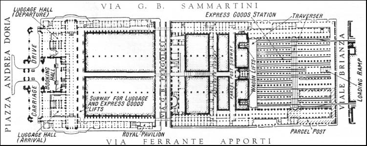 In that part of the station adjoining Via Ferrante Apporti a parcel-post office has been installed, which comprises a large sorting hall, a special hall for incoming parcels liable to duty, custom house, offices, and so forth. Outgoing parcels are loaded here direct into the mail vans, which are conveyed by the traversers to the lifts and brought to the platforms above. There they are attached to the respective trains. Below the parcel office a mail sorting office has been installed in the basement ; this is connected by a tunnel, underneath Via Ferrante Apporti, with the great sorting office built on the opposite side of Via Ferrante Apporti. The entrance to the goods station is in Via Sammartini. On this side large courtyards have been built, one for incoming, the other for outgoing traffic. The receiving and dispatch offices are installed here, as well as special dispatching rooms for newspapers, various accessory services and storage rooms for perishable goods.