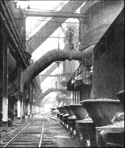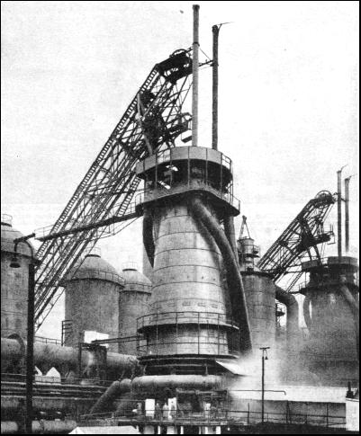 There are three constituents in the blast-furnace charge. The first, of course, is the iron ore itself ; the second is coke for combustion purposes ; and the third, in small quantities, is lime-stone. In older blast-furnace plants the charge is taken by lifts in large hand-barrows to a stage running along the top of the furnaces, and there tipped in. In the modern plants, however, the various components are collected from the bunkers by electrical appliances, automatically weighed, dumped into skip-hoists, and carried by power—usually up a long diagonal skipway—to the furnace-top, where they are dropped in, the whole series of operations practically dispensing with manual intervention. Charging is constantly in progress, for the blast-furnace is a non-stop worker. There are records of blast-furnaces having remained in continuous operation for over thirty years ; but the more rapid output demanded by modern methods renders such long working periods out of the question, owing to the need for much more frequent renewal of the masonry lining. But during the years that a furnace is "in blast," the solid charge is being introduced uninterruptedly at the top, and by periodic tapping the two products of smelting—iron and slag—are being withdrawn from the bottom. A third very important by-product—the blastfurnace gas—is led away from the upper part of the furnace by the large pipes that are a prominent feature of the equipment. Most important of all is the "blast," from which the furnace derives its name. This is introduced at the base of the furnace, just above the hearth level, through a series of water-cooled tuyères which project through the masonry lining into the interior. Turbo-blowers supply blast at a pressure of from seven to twenty pounds per square inch. In the earliest blast-furnace plants the blast was unheated air, and what is known as "cold-blast iron" was produced. Modern output conditions require, however, that the blast shall be heated before introduction, in order to speed up the operation of smelting. Grouped round the blast-furnaces, therefore, are seen a series of mushroom-headed steel towers, from two to four to a furnace. Each of these "stoves," as they are called, is filled with firebrick built up in the form of a honeycomb, and the principle of their use is ingenious. Part of the hot blast-furnace gases is taken from the top of one of the furnaces through a stove, where it is burnt, thus giving out its heat to the honeycomb. Then the gas is turned into another stove, and the cold air from the blowers is carried through the heated stove, extracting its heat before passing into the furnace. Some of the stoves are thus always acquiring heat, while others are giving it out, and the blast-furnace in this way provides its own heat for heating up the air-blast. On entering the furnace the oxygen in the blast is quickly consumed, producing carbon monoxide, which is the principal agent in the reduction of the charge.