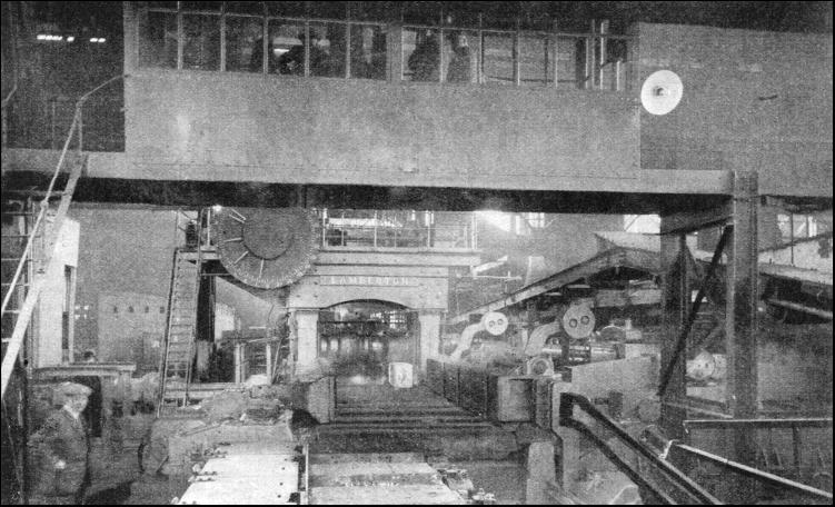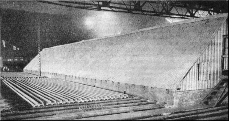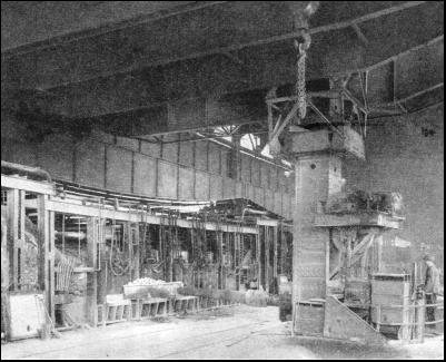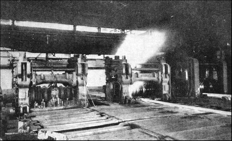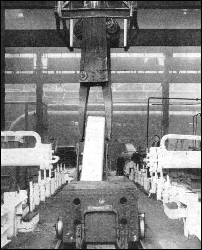 Reliance is placed on the carbon for hardness, and on the manganese for toughness, a good internal structure, and a smooth outer skin ; silicon helps to purify the metal ; but sulphur and phosphorus, which would make for brittleness, must be reduced to a minimum. The remainder of the steel content, of course, is almost entirely iron obtained from the ore. Steel-making is carried on in a row of furnaces, in the "melting shop," as it is called. From the blast furnaces iron is brought in its molten condition and poured into an enormous vessel termed a "mixer." The mixer has a capacity of 400 tons and more ; iron from different furnaces is mixed in it to secure a uniform quality. From the mixer the open-hearth furnace receives its charge of molten iron ; on the opposite side of the furnace other ingredients are introduced, such as steel scrap, a little iron ore, and so on. The solid part of the charge is inserted by an ingenious electrically-driven charger, which seizes the "boxes" from their wagons, one by one, pushes them into the open furnace door, turns them upside down so that their contents drop into the bath, inverts the box again, withdraws it, and swings. it back on to its wagon—all in a matter of seconds. From time to time the charge is sampled, and the samples are quickly analysed, chiefly by automatic means, at a small laboratory on the melting-shop stage. The interior of the boiling mass has to be inspected from time to time, but it can be looked at only with the protection of blue glasses. Finally, when the refinement is judged to be complete, there comes the moment to. tap the charge. By an overhead crane, probably of at least one hundred tons capacity, a gigantic ladle has been brought to the tapping side of the furnace. The plug in the tapping hole is withdrawn, and out pours the stream of molten steel, of almost incredible brilliance into the ladle. During this pouring, there are added to the ladle carefully calculated quantities of ferro-maniganese and ferro-silicon, to bring the analysis to the exact percentages of carbon, manganese, and silicon required. Then this vast culinary operation is complete. When the ladle has been filled with anything from 50 to 90 tons of molten steel, it is taken away to a platform under which runs a train of empty ingot-moulds. A stopper on the underside of the ladle is opened, and one by one the moulds are filled with the glowing metal. In these moulds the steel remains no longer than the time necessary to set in solid form, and the ingots are then ready, while still very hot, for the next stage of the operations. In preparation for rolling, the ingot is first "stripped"—that is to say, the ingot-mould is removed and the ingot itself exposed to view. The size of the ingot will vary according to the weight and length of rail to be rolled, but it is calculated to a nicety in order to reduce waste metal to a minimum. To get, say, three sixty-feet rails of the ninety-five pounds per yard section requires an ingot weighing about three and a quarter tons. The string of ingots from the "heat" or "cast" of steel that has just been teemed is now brought to the rail-mill, and one by one the ingots are lowered into fiery apertures below the floor-level, known as soaking-pits. Here each ingot "soaks" in heat for a short time, so that it may be at an even heat right through when rolling begins.