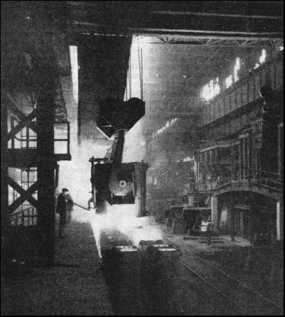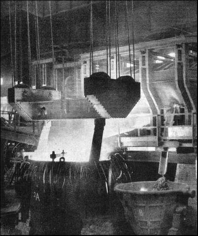 As the earthy constituents mixed with the ore would otherwise be infusible, the limestone is added to the charge to provide a "flux" which will combine with them, at the temperature of the furnace, to produce a fusible slag. This slag, being lighter, floats on the top of the metallic iron, which collects in liquid form in the hearth at the bottom of the furnace. From an upper vent the slag is being tapped almost continuously. It is run into great ladles which are usually taken outside the works area to be tipped on to the vast slag-heaps that are a prominent feature of ironworking districts. In these progressive days, however, many uses are found for what was at one time no more than a waste product ; among them are railway ballast, "tarmac" or tarred broken slag for road making, and the manufacture of slag concrete and slag bricks. A very large proportion of the blast-furnace slag now produced is not wasted, but is now made to serve these useful purposes. Many years ago, it was customary to allow the gaseous product of the smelting to burn to waste in enormous flares at the top of the furnaces ; but no such wasteful procedure is followed to-day, as these gases contain very valuable constituents. In part they are employed, as we have seen, to heat the stoves by which the air-blast is heated before use. A considerable proportion, also, is generally used to fire boilers which produce steam to drive the rolling-mills, or to drive turbo-alternators and gas engines producing electricity for driving the mills and a thousand and one other steelworks accessories. The exhaust steam from the mills is very likely to be led back to drive the turbo-alternators which produce the air-blast for the furnaces. These amazing cycles of operation, designed to prevent the loss of any scrap of developed heat energy which can be put to a useful purpose, are the secret of the efficiency of modern ironworks and steelworks. The charge of the blast-furnace is thus always gradually moving downwards, solid at the top and molten at the bottom. At intervals the vent from the hearth, which is kept closed with a clay plug, is opened, and the accumulated contents of the hearth are run out. If the iron is to be disposed of as iron, it is run into the "pig-bed," which is an area of sand below the furnace in which channels have been moulded in the shape of a gigantic comb. Here the iron is allowed to cool and solidify, and the combs are later broken into their constituent parts, or "pigs," and loaded away. But if the iron is to be converted into steel, it is not cooled, for that would involve wasteful loss of heat. It is therefore run in its molten condition into a ladle, and the ladle is rapidly passed—usually by a works locomotive along a railway line—to the steel plant, which is probably closely adjacent. In its present condition the iron is "cast iron," a brittle and more or less impure product. Steel, on the other hand, is a very pure form of iron with which certain constituents—chiefly carbon and manganese—have been chemically combined to give entirely different physical properties. Steelmaking is essentially a work of purification, and the addition of the required elements in their proper proportions. Minute changes in the percentages of the elements concerned result in very considerable alterations in the quality of the steel, and the process of steel-making must therefore be carried out with the utmost care and precision. In the original process of steel production devised by Henry Bessemer in 1855, refinement of the iron was carried out in a bottle-shaped vessel known as a "converter." This was placed in a horizontal position to receive the charge and, after a powerful air-blast had been turned on through tuyères at the bottom, was swung up into the vertical position again, so that this air-blast passed right through the charge. Thus all the impurities were burned out in a reaction so violent, with an accompaniment of showers of bursting sparks from the top of the vessel, that this has always been one of the most spectacular of all steelworks operations.