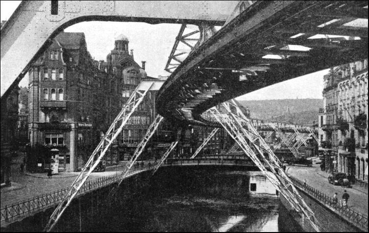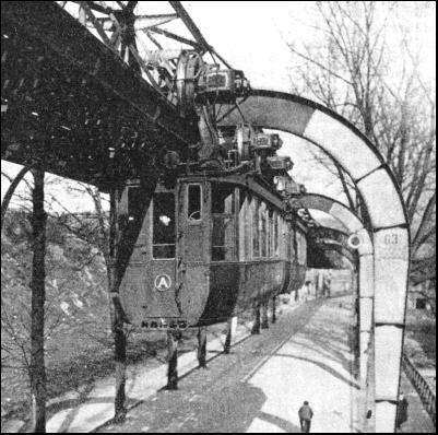 Overhead railways may be divided into two classes : those in which the ordinary methods of building and track construction are employed, and those involving the use of a specialized form of track work. In the second category was the little Listowel and Ballybunion Railway, in Ireland, a pioneer among monorail systems. This line, which had a length of ten and a quarter miles, was not very successful, and ceased working in 1924. The monorail system employed was that of Lartigue, in which the main or running rail was carried on a series of trestle-like supports, while the engines and coaches were suspended on either side of the main rail, like panniers on the back of a mule, the upper rail serving to carry the load. This unusual method of traction required locomotives and rolling-stock of unconventional design. The disadvantages of the system is that it is not suited to heavy traffic, although that was not a consideration on this line, while the principle of construction is not particularly well adapted to shunting or switching movements. Those difficulties were not, however, responsible for the closing of the line ; but, as has been so with many other small Irish railways, the traffic was insufficient. The Listowel and Ballybunion Railway was a cross between the surface line and the elevated railway proper, since its clearance above road level was much lower than that of the overhead systems described above. It may also be regarded as an intermediary between the orthodox method of rolling-stock design and that in which the wheels are placed above the vehicle, of which the best-known example is the Elberfeld-Barmen Railway in Germany, which connects the twin cities that give it its name.
