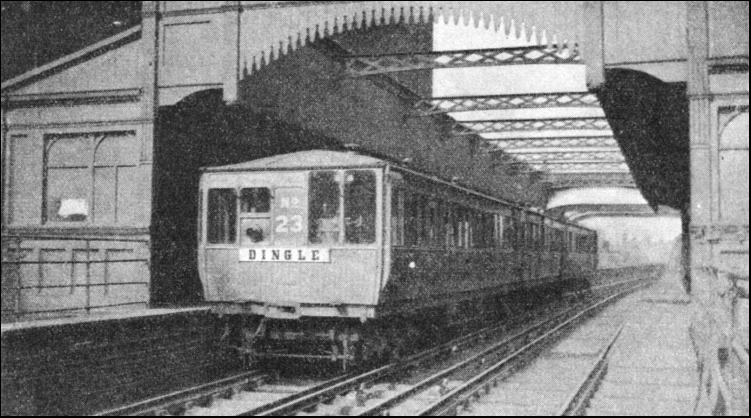 Except for the New York Elevated, we have so far been considering railways that are above ground for only part of their length. Unique in that it traverses a great city and runs above ground for its entire length is the Liverpool Overhead Railway, the initial section of which was opened for traffic in 1893. This line was electrically operated from the start, and was the first overhead electric railway in the world. It was the first electric railway of commercial importance in the United Kingdom, although the Brighton Electric and the Giant's Causeway and Portrush lines were opened ten years earlier. The reason for this railway, which is six and a half miles in length and was a pioneer in the use of automatic signalling, was the Liverpool dock system. The line follows the west bank of the Mersey, and fifteen out of its sixteen stations serve the docks. The system was not originally promoted by a railway company, but took over Parliamentary powers first granted to the Mersey Docks and Harbour Board under two Overhead Railway Acts. A spur line was built in 1905 to permit of through working to and from the then Lancashire and Yorkshire's Liverpool, Southport and Crossens electrified line, and such a service was regularly provided until 1922, when it was withdrawn owing to road competition. But once a year, on Grand National Day, a special through service is still maintained by the Liverpool Overhead to and from Aintree.