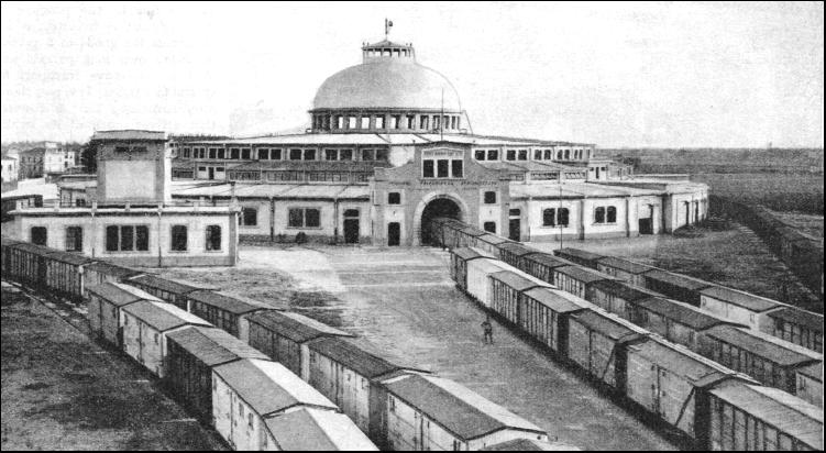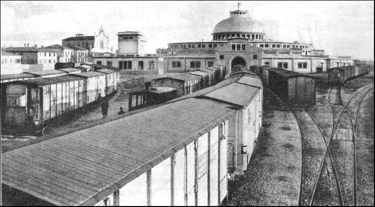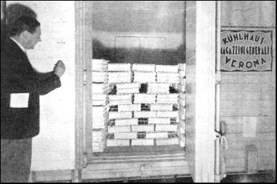 The transport of fruit and vegetables by refrigerated trucks necessitates various preliminary operations which cannot be carried out by the small farmer. As Italy is pre-eminently a country of small-holders, means had to be devised to create suitable organizations to undertake the grading and packing of the fruit. This is a most important operation on which depends the success of sales in foreign markets. Badly packed fruit is liable to arrive in a damaged condition at its destination. Sometimes whole cases have to be thrown away. In other instances part of the contents of a package is damaged and fetches, naturally, very little or nothing when put up for sale. Only well-packed fruit which reaches, say, Covent Garden in a perfect state will fetch good prices for the benefit of the small-holder. Many of the farmers have formed co-operative societies which own grading and packing warehouses in the principal centres. Some of them have installed refrigerating plants to keep the fruit at suitable temperatures before it is loaded in the refrigerated trucks. In other instances cold storage warehouses have been erected by private companies, or by municipalities owning the public market halls. They are generally found in the main agricultural and railway centres. Prominent among these cold storage warehouses is that of Verona, built in 1931, on an original plan. It was, and probably still is, the largest of its kind in Europe. Verona, situated in the centre of the Lombardy plains, is one of the most important railway junctions in Italy. It lies at the intersection of the trunk lines from Bologna to Brenner (for Austria) and from Milan to Venice. It is famous for its peaches and other fruit. In spring the blossoming orchards are an unforgettable sight, not less beautiful than they appeared to Romeo under "yonder blessed moon that tips with silver all these fruit-tree tops."
