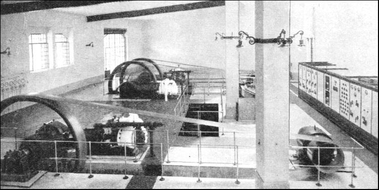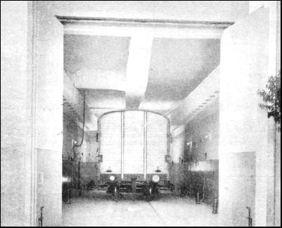 The refrigerating machinery consists of three similar horizontal tubular compressors, running at 150 revolutions per minute. The electrical machinery comprises three 3-phase asynchronous self-compensated motors of 150 h.p. each. Three electric pumps coupled to 15 h.p. motors pump water from a specially sunk well. Other motors are installed for the ice factory, for operating cranes, the turn-tables and so forth, the total power installed being 969 h.p. An outdoor transformer Cabin contains five transformers totalling 1,050 kVA for stepping down incoming current at 6,000 volts to the required service voltage. In the machinery hall and in the manager's office illuminated indicators are installed which represent a diagram the whole installation. Whenever a gallery is occupied by trucks or a cell is in use this is shown on the indicator. Similarly each fan, each motor, each crane, and each transformer is shown, when working, on the indicator.