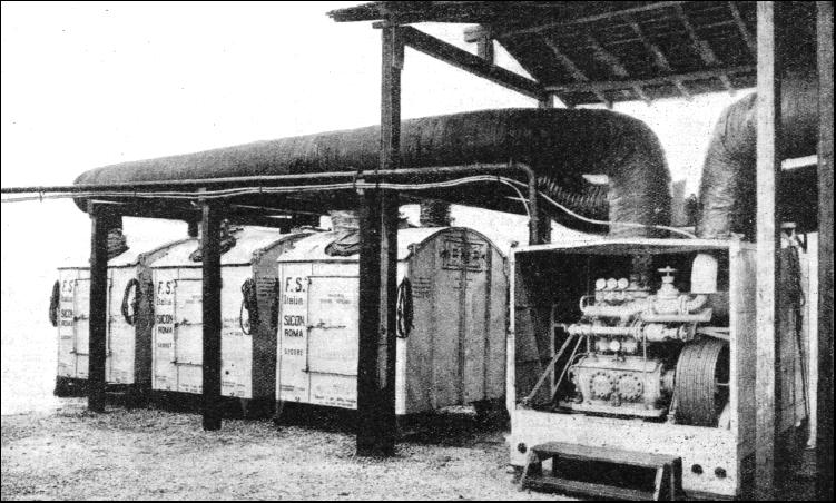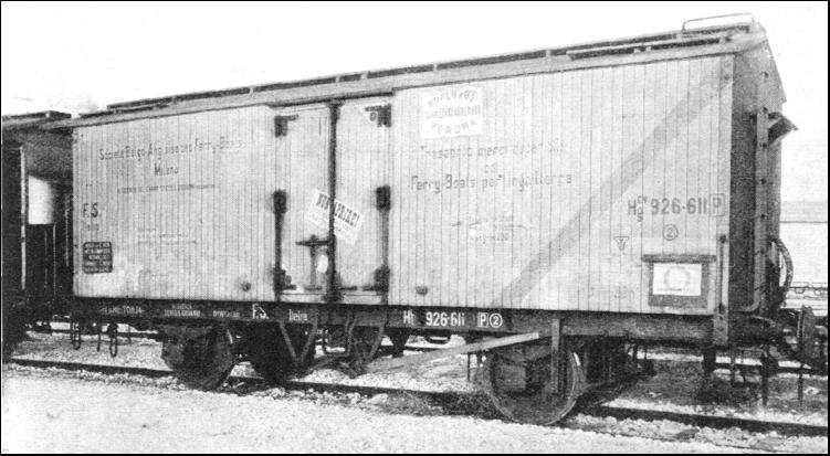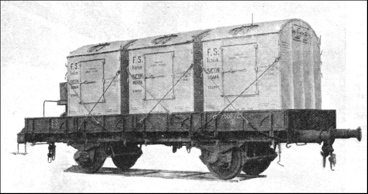 Certain fruits and vegetables do not require transport by refrigerated trucks. It is necessary only to load them in isothermic trucks suitably insulated against excessive heat. The insulating properties of these trucks are severely tested in the cells. The State Railways have built many thousands of special trucks of both kinds, all of which comply with the British requirements, as the traffic from Italy to England is a considerable one. The Societá Italiana Ferryboats in Milan has hired 1,300 such trucks from the State Railways for use on the Zeebrugge-Harwich ferry.