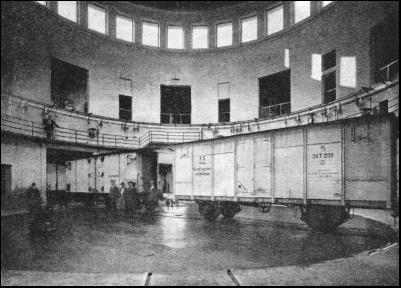 To increase the storage capacity of the refrigerated cells an intermediate floor has been built about 6-1/2 ft. above the ground floor. It is constructed of wooden trestles supported by concrete girders. The trestle construction allows the free circulation of the cold air. The first floor of the building is constructed in the form of a ring, the inner diameter of which is 82 ft. and the outer 230 ft. On this floor an ice-making factory is installed, occupying a hall 151 ft. long and 20 ft. wide. The plant can produce 60 tons of ice a day. On either side of this hall are situated the ice storage rooms, which have a capacity of 300 tons each. The ice plant is situated above the main entrance gallery and is connected with it by means of a number of chutes through which ice is shot into the ice tanks of the refrigerator vans standing in the main gallery. Four trucks can be filled simultaneously with ice, the operation taking only ten minutes. Once the trucks have been filled with ice they are conveyed over the turn-table to the refrigerating galleries for pre-cooling.